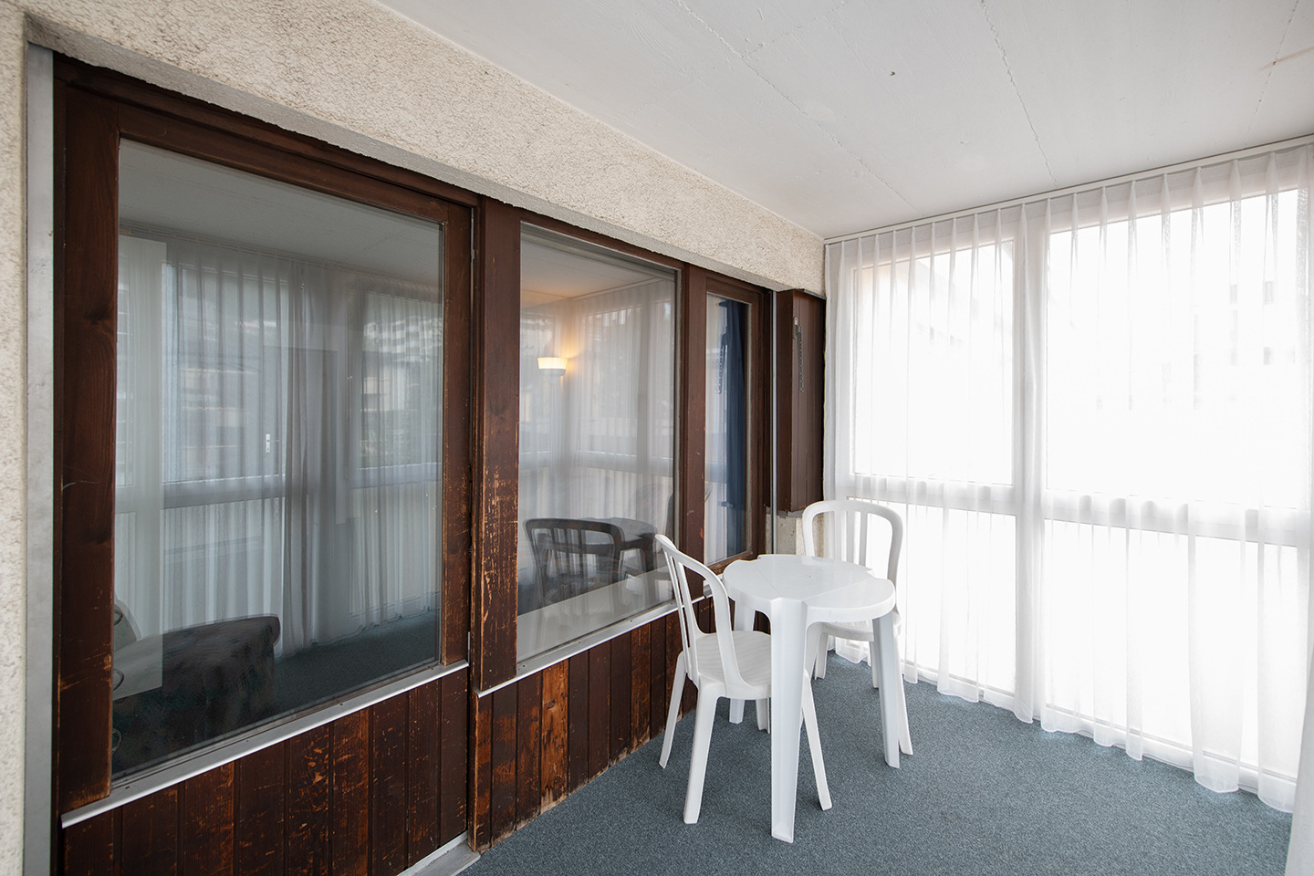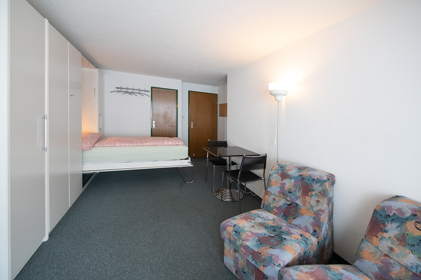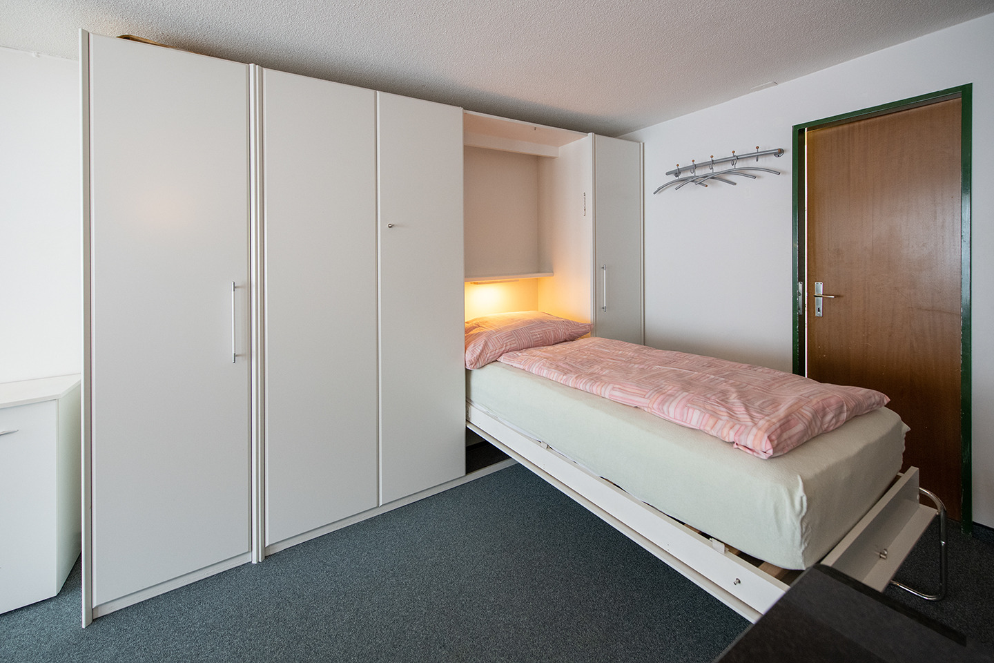 Wohnschlafraum mit 2 Schrankbetten, Polsterstühle Esstisch, TV-Anschluss.