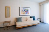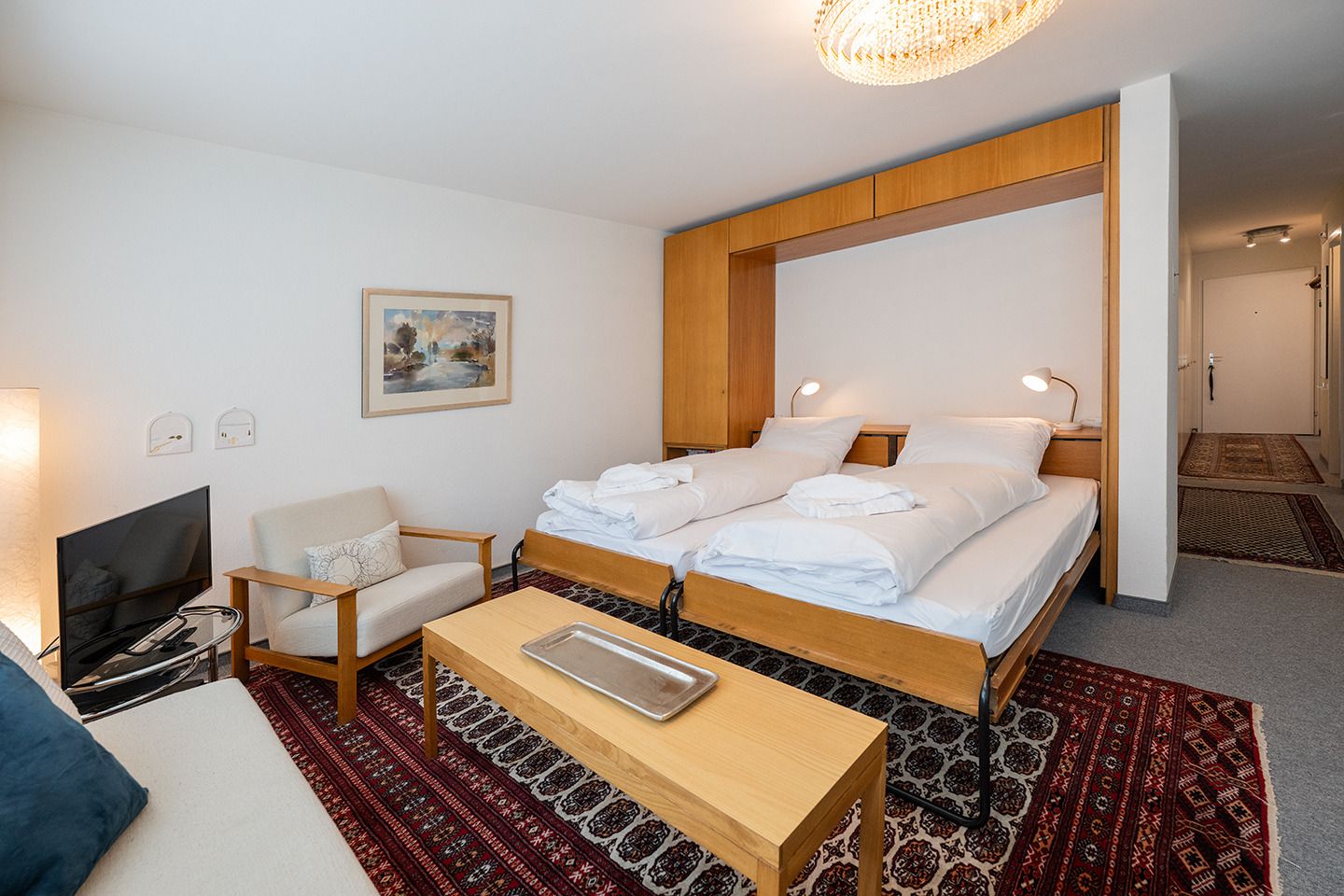 Wohnraum mit Sofabett, 2 Klappbetten, Essecke, TV, W-LAN.