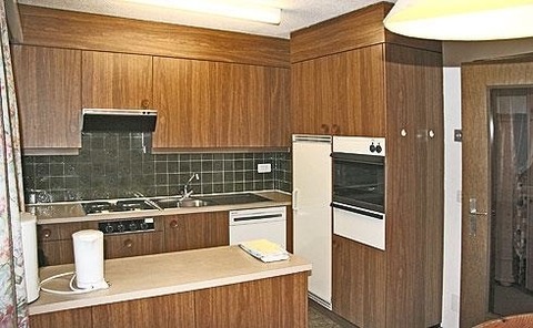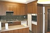 Grosse, geschlossene Küche mit Essecke, 4-Plattenherd, Kühlschrank mit Tiefgefrierfach, Backofen, Geschirrspüler.
