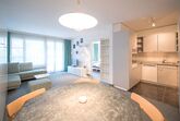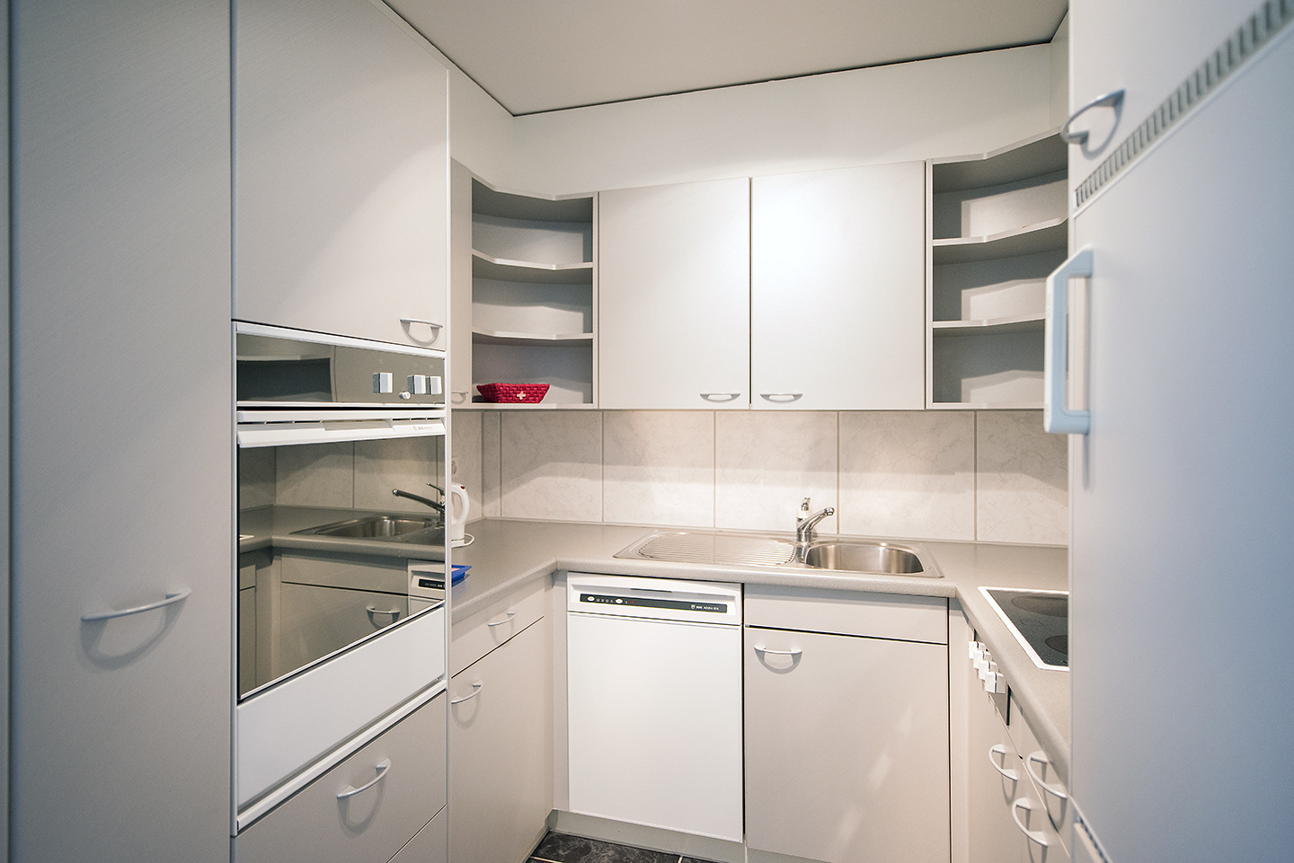 Offene Küche mit 4-Platten Glaskeramikherd, Backofen, Kühlschrank mit Tiefgefrierfach, Geschirrspüler, Kapsel Kaffeemaschine (Delizio).