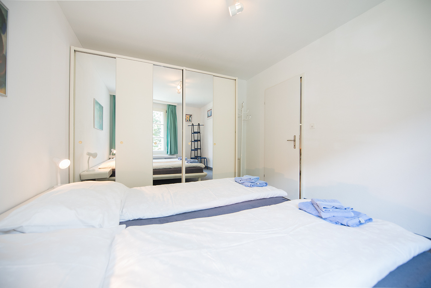 Schlafzimmer mit Doppelbett (2 Matratzen, 80x200).