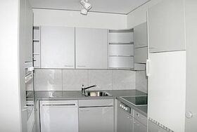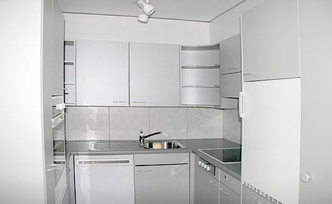 Offene Küche mit 4-Platten Glaskeramikherd, Backofen, Kühlschrank mit Tiefgefrierfach, Geschirrspüler.