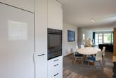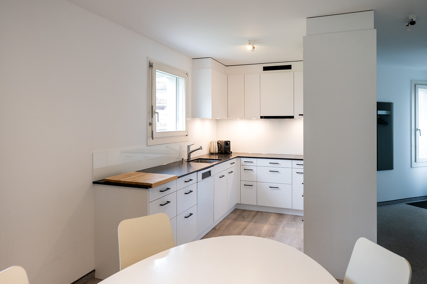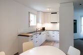 Moderne und neu umgebaute, offene Küche mit 4-Platten Glaskeramikherd, Backofen, Mikrowelle, Kühlschrank mit Tiefgefrierfach, Geschirrspüler, Kapsel-Kaffeemaschine (Delizio).