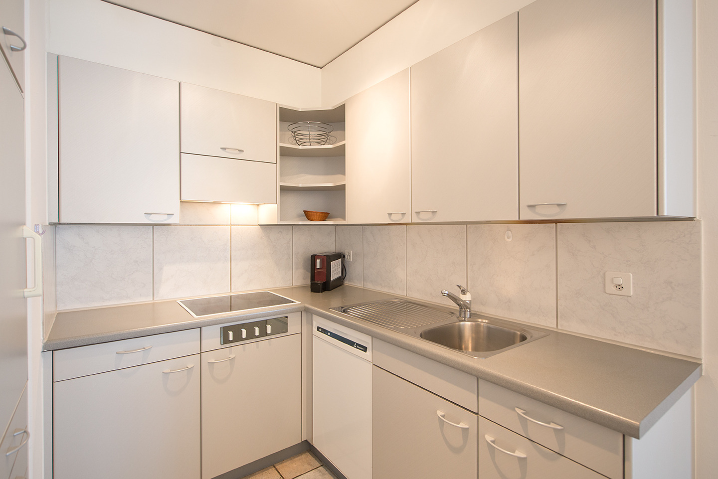 Offene Küche mit 4-Platten Glaskeramikherd, Backofen, Kühlschrank mit Tiefgefrierfach, Geschirrspüler,