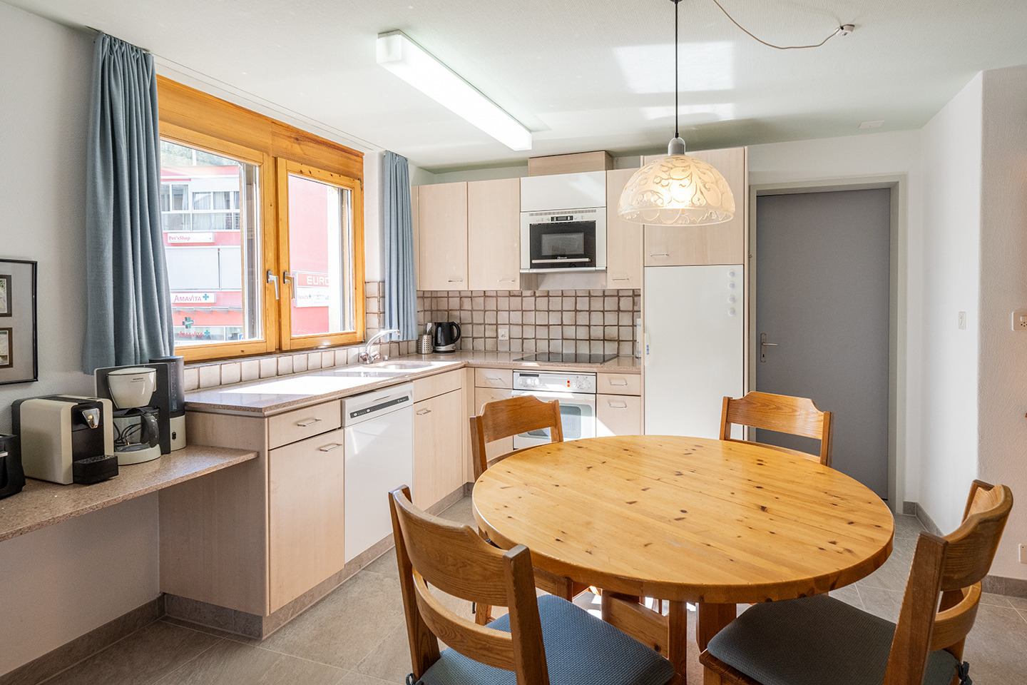 Offene Küche mit Glaskeramik Herd, Backofen, Kühlschrank mit Tiefgefrierfach, Geschirrspüler.