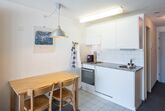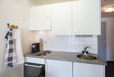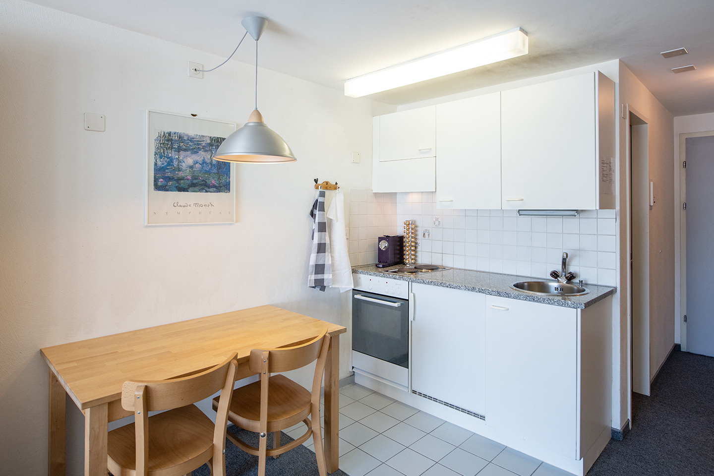 Offene Küche mit 2-Plattenherd, Backofen, Kühlschrank mit Tiefgefrierfach, Kapsel-Kaffeemaschine.