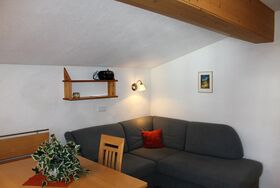 Appartement mit Nachmittagssonne und gemütlicher, voll ausgestatteter Wohnküche, das Schlafzimmer mit Naturholzmöbel und Parkettboden, das 3. Bett kann zum Etagenbett erweitert werden. Vom Bad aus haben Sie freien Blick zur Porze.
