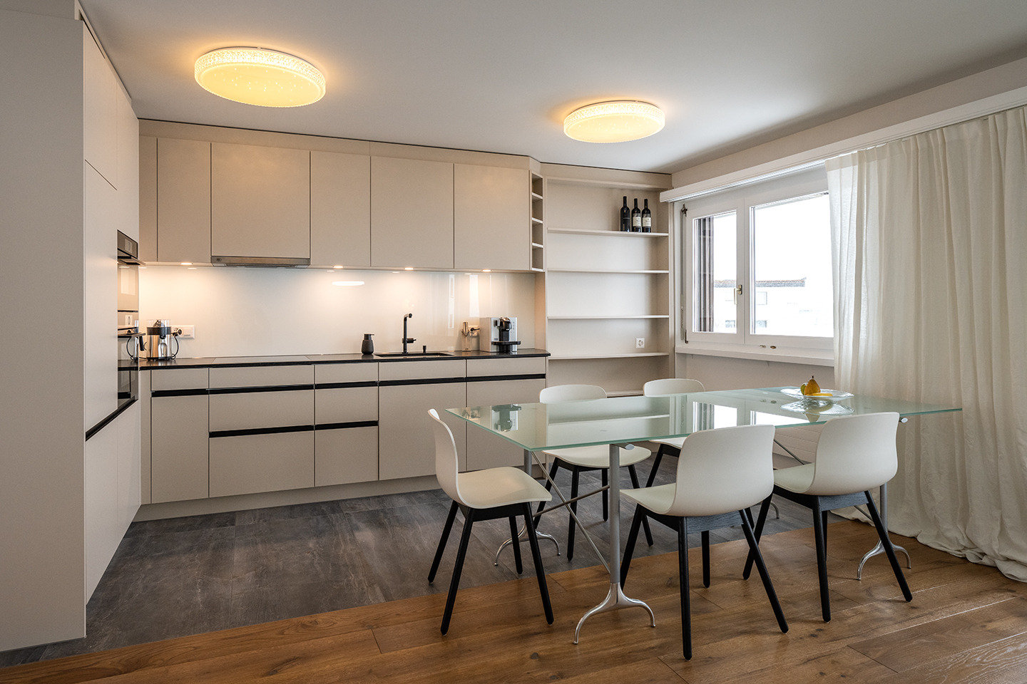 Offene Küche mit Dampfabzug, mit 4-Platten Glaskeramikherd (Induktion), Kühlschrank mit Tiefgefrierfach,