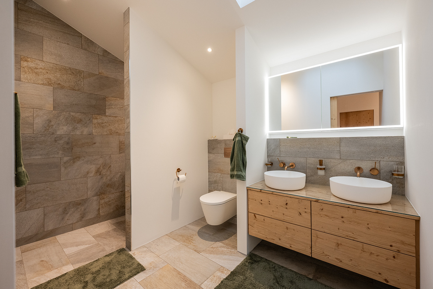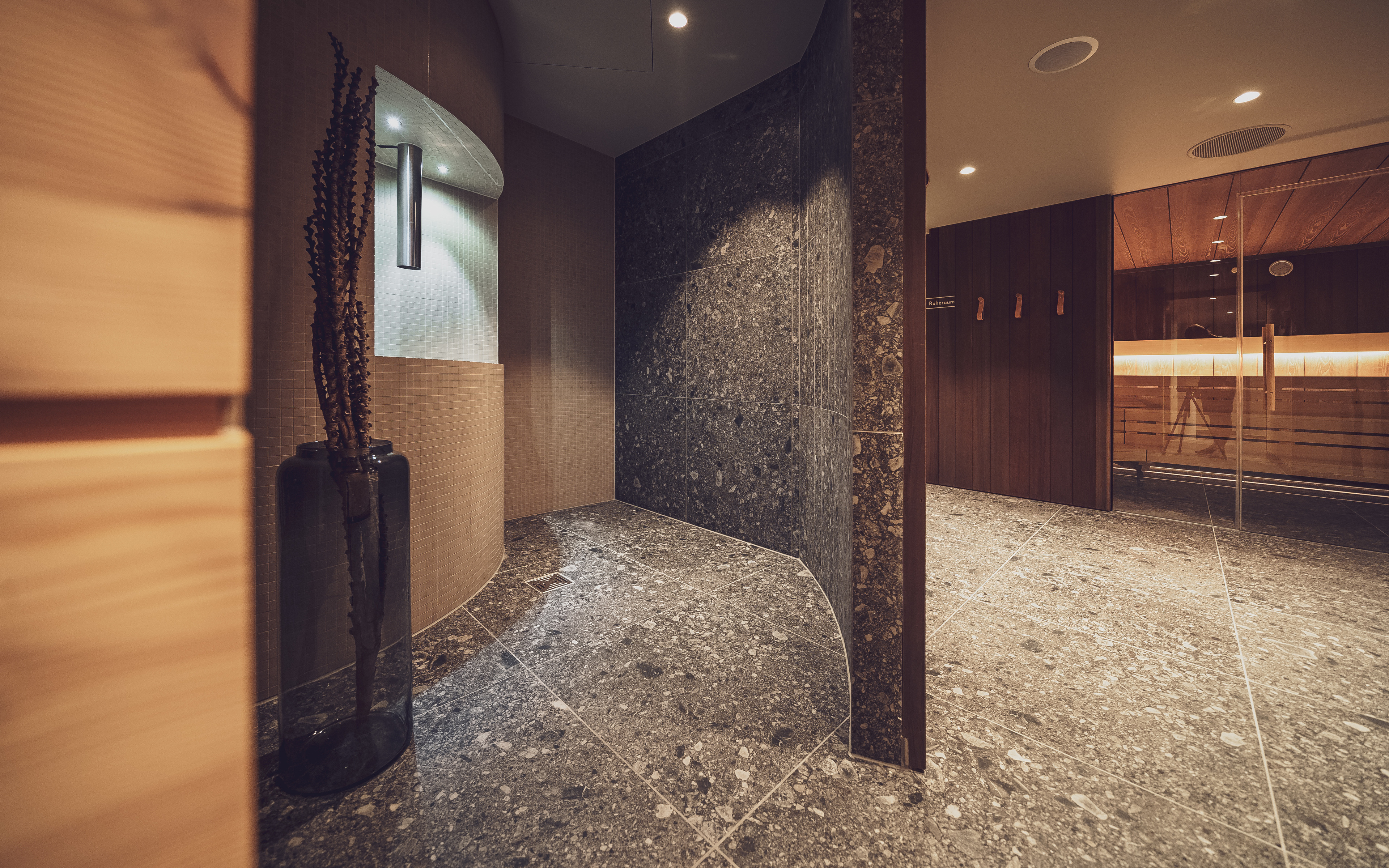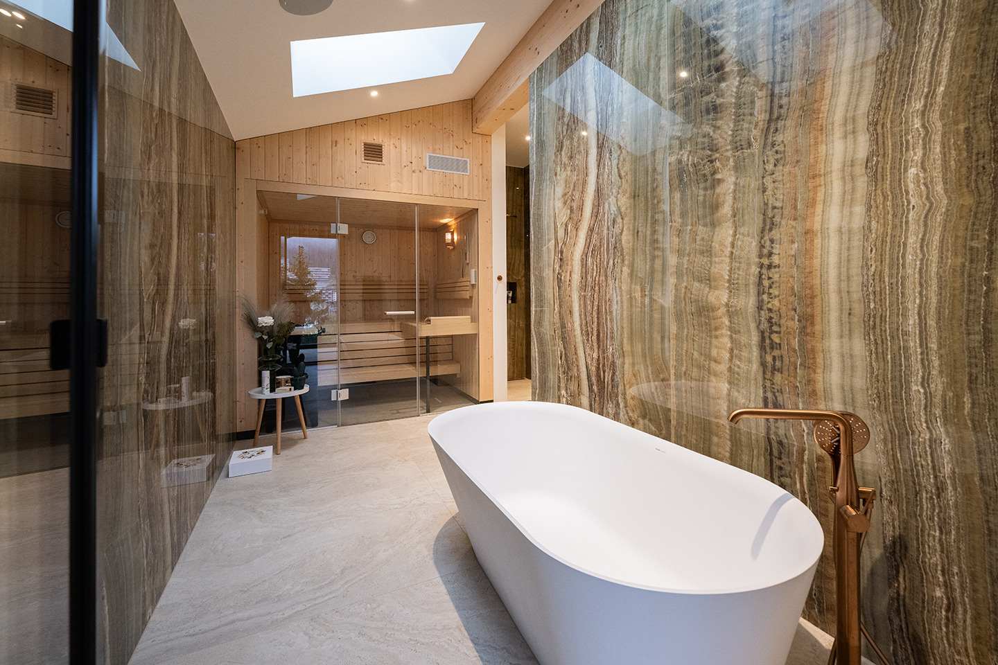 Wellness Bereich in der Wohnung mit Bio Sauna, Badewanne und Regendusche.