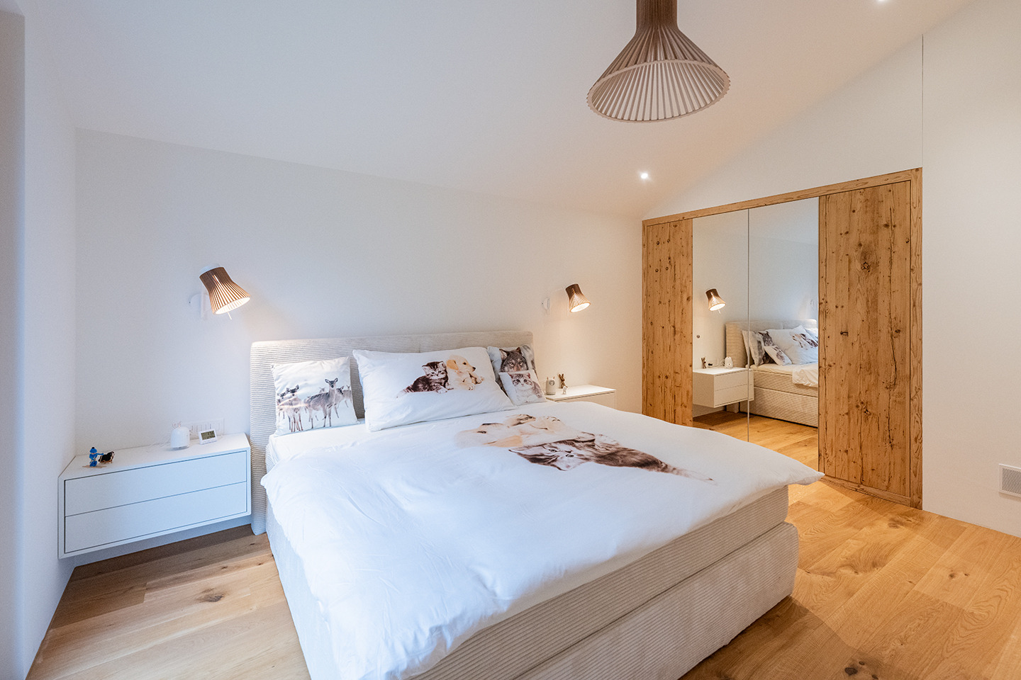 1 Schlafzimmer mit Boxspring Doppelbett (2 Matratzen, 90x200), WC/Dusche.