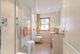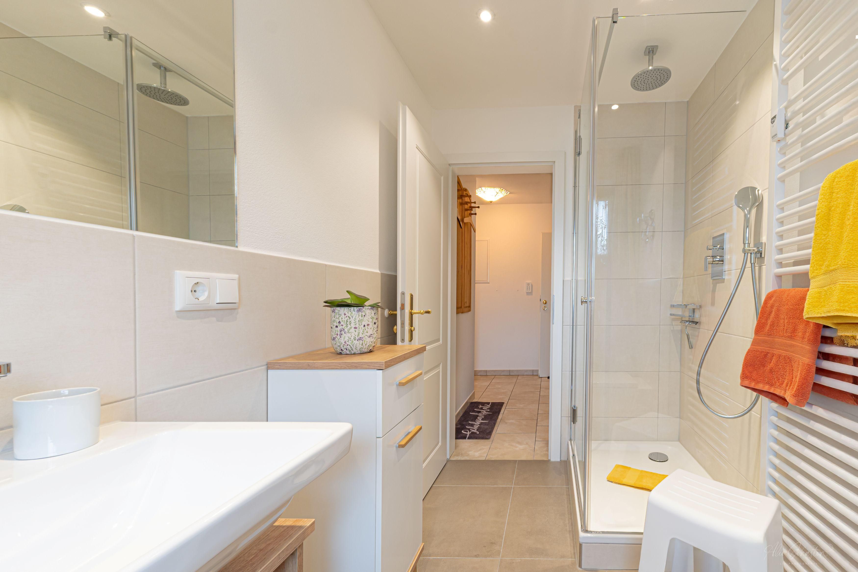 Helle Wohnung im zweiten Stock mit separater, vollausgestatteter Küche und ruhigem Schlafzimmer mit Doppelbett. Geräumiger Wohnraum mit Couch/Schlafcouch, Smart-TV, Balkonzugang, Esstisch und Eckbank. Modernes Badezimmer mit WC, Waschbecken, Dusche mit tiefem Einstieg, Rainshower und Fenster.