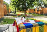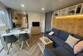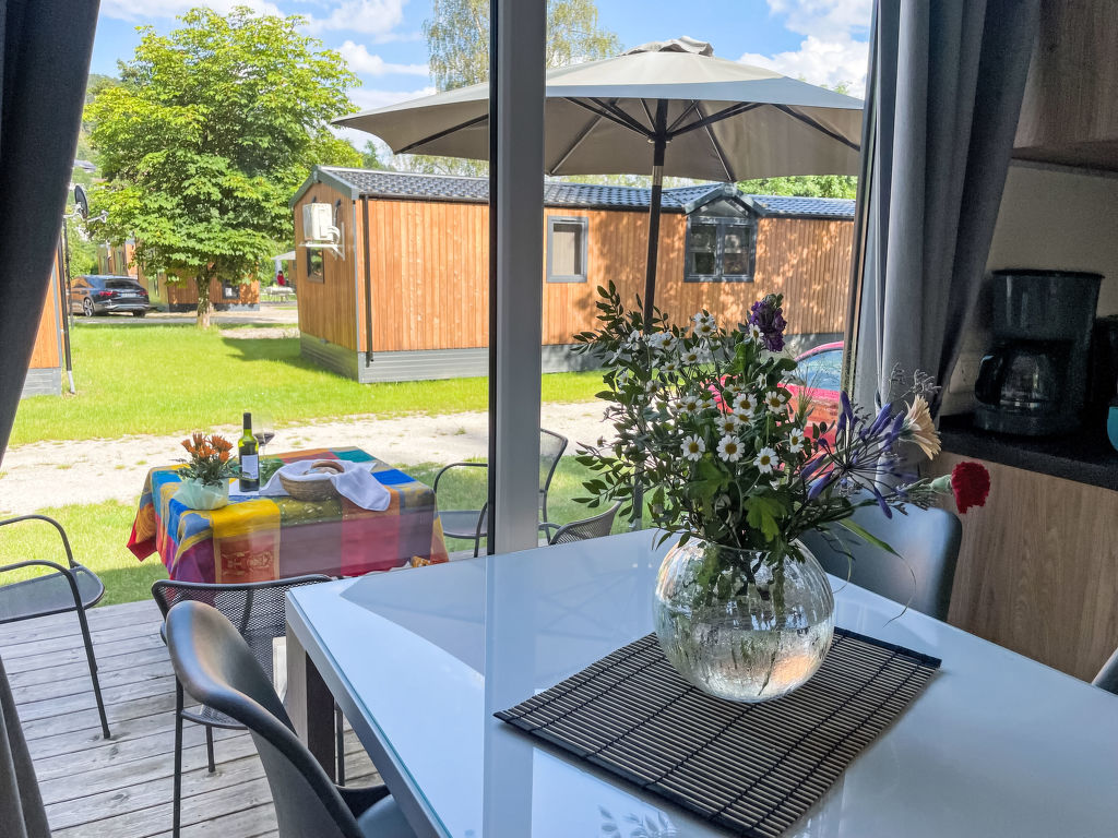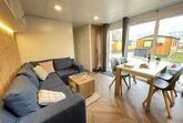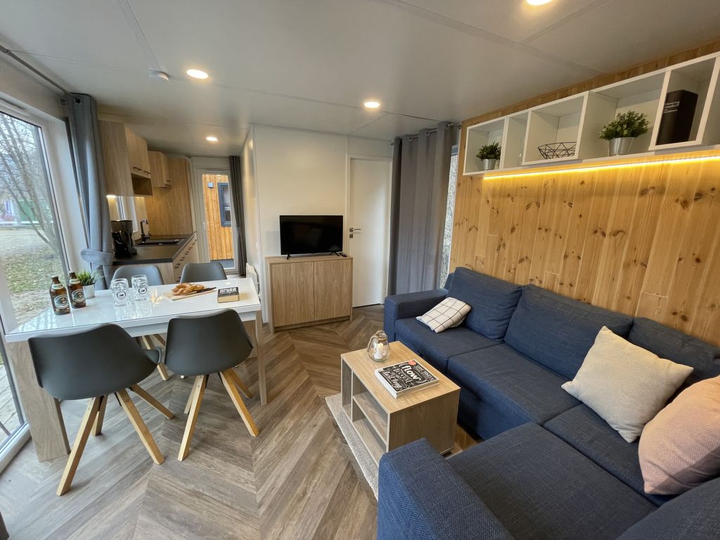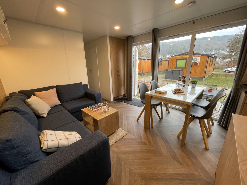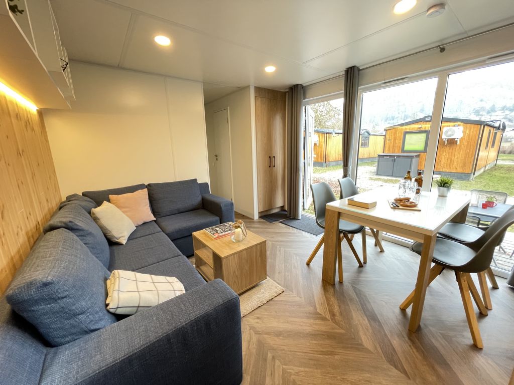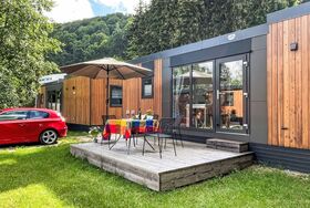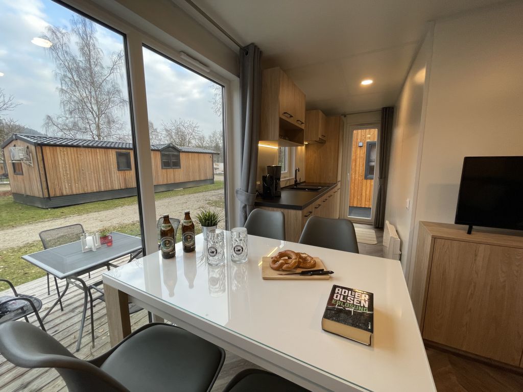 Tiny Haus Rotkehlchen, 3-Zimmer-Mobilheim 32 m2, im Erdgeschoss. Gemütlich eingerichtet: Wohn-/Schlafzimmer mit 1 Diwanbett (120 cm, Länge 170 cm), Esstisch und Sat-TV (Flachbildschirm). Ausgang zur Terrasse. 1 Zimmer mit 1 franz. Bett (140 cm, Länge 200 cm). 1 Zimmer mit 2 Betten (80 cm, Länge 200 cm). Kochnische (4 Glaskeramikplatten, Wasserkocher, Tiefkühler, elektrische Kaffeemaschine). Dusche, sep. WC. E-Heizung. Kleine Terrasse. Terrassenmöbel. Parkplatz (1 Auto) beim Haus. Bitte beachten: Nichtraucher-Haus. Maximal 1 Haustier/Hund erlaubt. Rauchmelder.