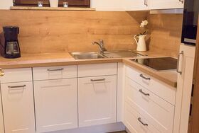 - eine voll ausgestattete Küche mit neuesten Geräten (Cerankochfeld, Backofen, Kühl-/Gefrierkombination, Kaffeemaschine, Wasserkocher, Toaster).