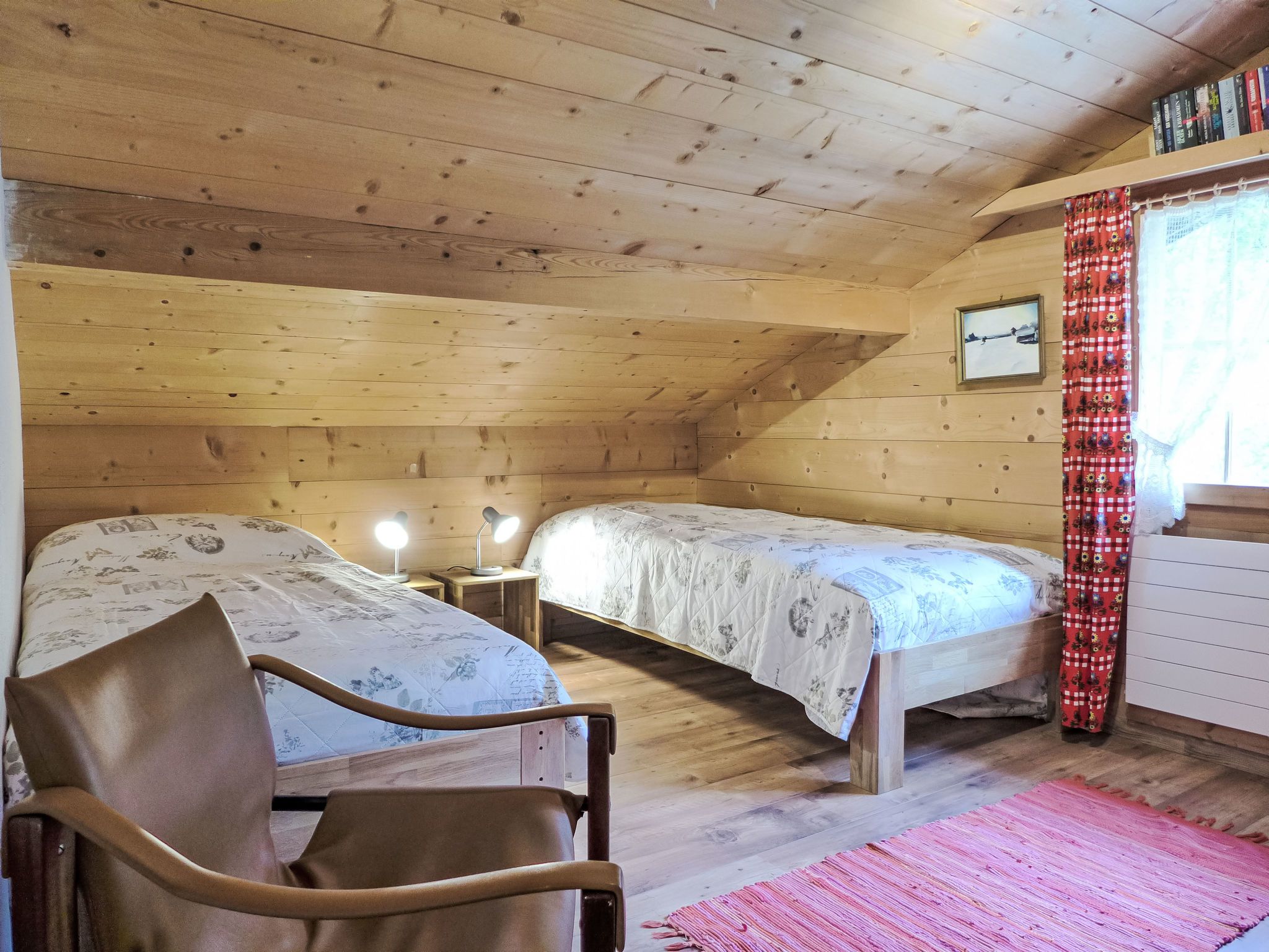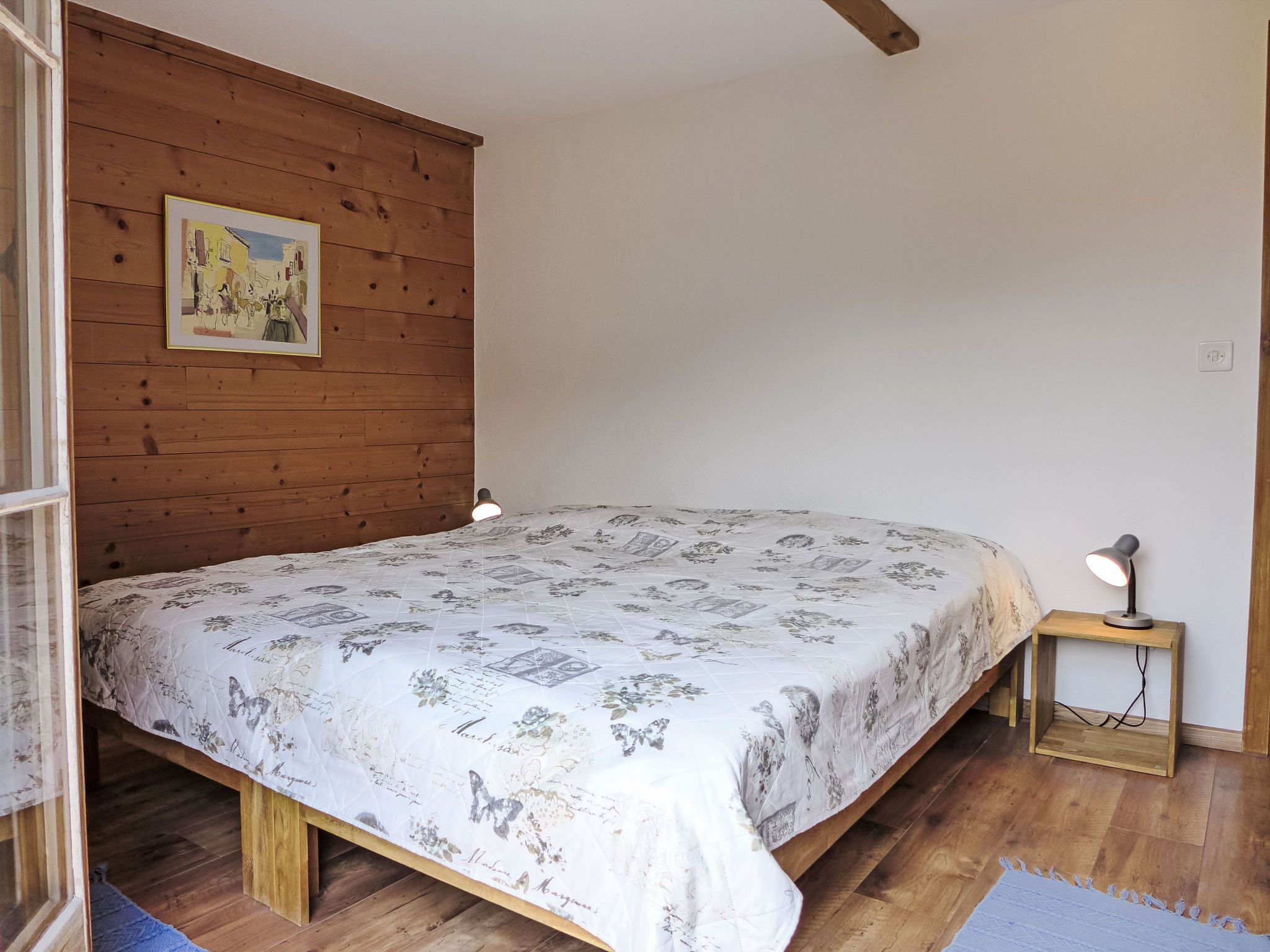 7-Zimmer-Wohnung 200 m2 auf 2 Stockwerken, im Obergeschoss. Rustikal und gemütlich eingerichtet: offenes Wohn-/Esszimmer mit Wintergarten mit offenem Kamin und Sat-TV. Ausgang zum Balkon. 2 Zimmer, jedes Zimmer mit 2 Betten (90 cm, Länge 200 cm). Offene Küche (Geschirrspüler, 4 Glaskeramikplatten, Toaster, Wasserkocher, elektrische Kaffeemaschine, Racletteofen, Fondue Set (Käse)) mit Esstisch. Sep. WC. Dachgeschoss: 2 Zimmer, jedes Zimmer mit 2 Betten (90 cm, Länge 200 cm). 2 Zimmer, jedes Zimmer mit 1 Bett (90 cm, Länge 200 cm). Dusche/WC. Grosser Balkon, Gartensitzplatz. Terrassenmöbel, Liegestühle, Wintergarten. Herrliche Panoramasicht auf die Berge und das Tal. Zur Verfügung: Kinderhochstuhl, Babybett bis 2 Jahre (extra), Holz (gratis). Internet (Wireless LAN). Parkplatz (2 Autos). Bitte beachten: Nichtraucher-Unterkunft. Rauchmelder, Feuerlöscher.