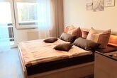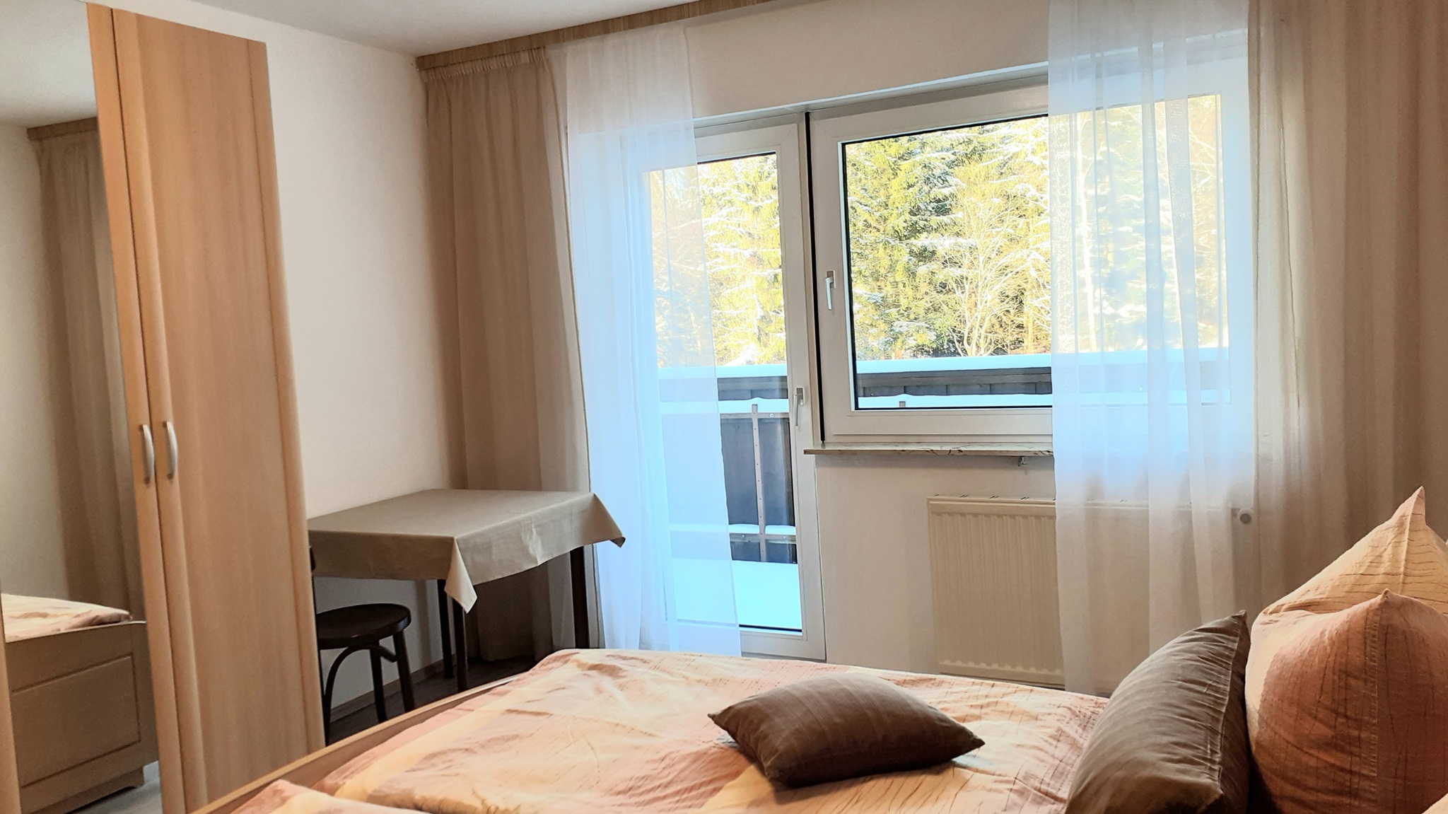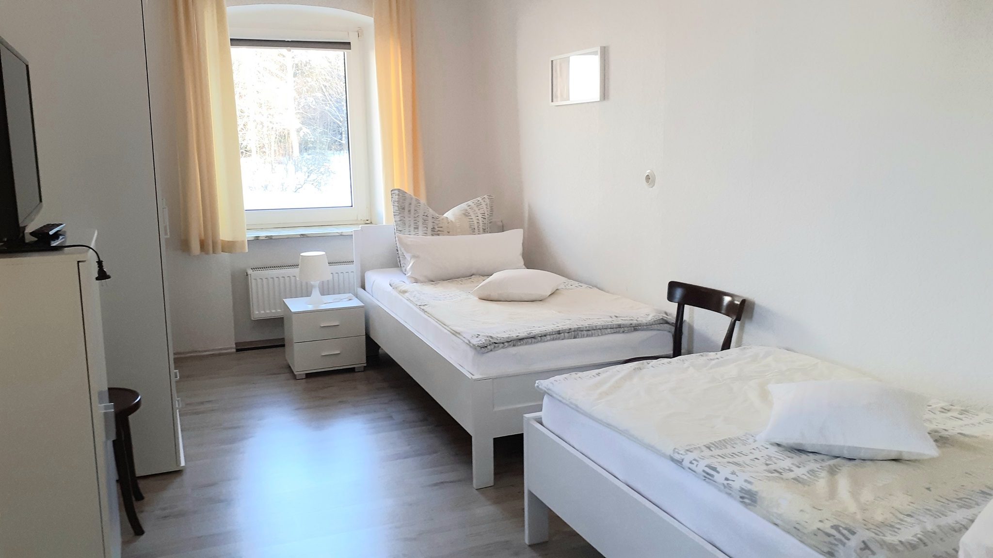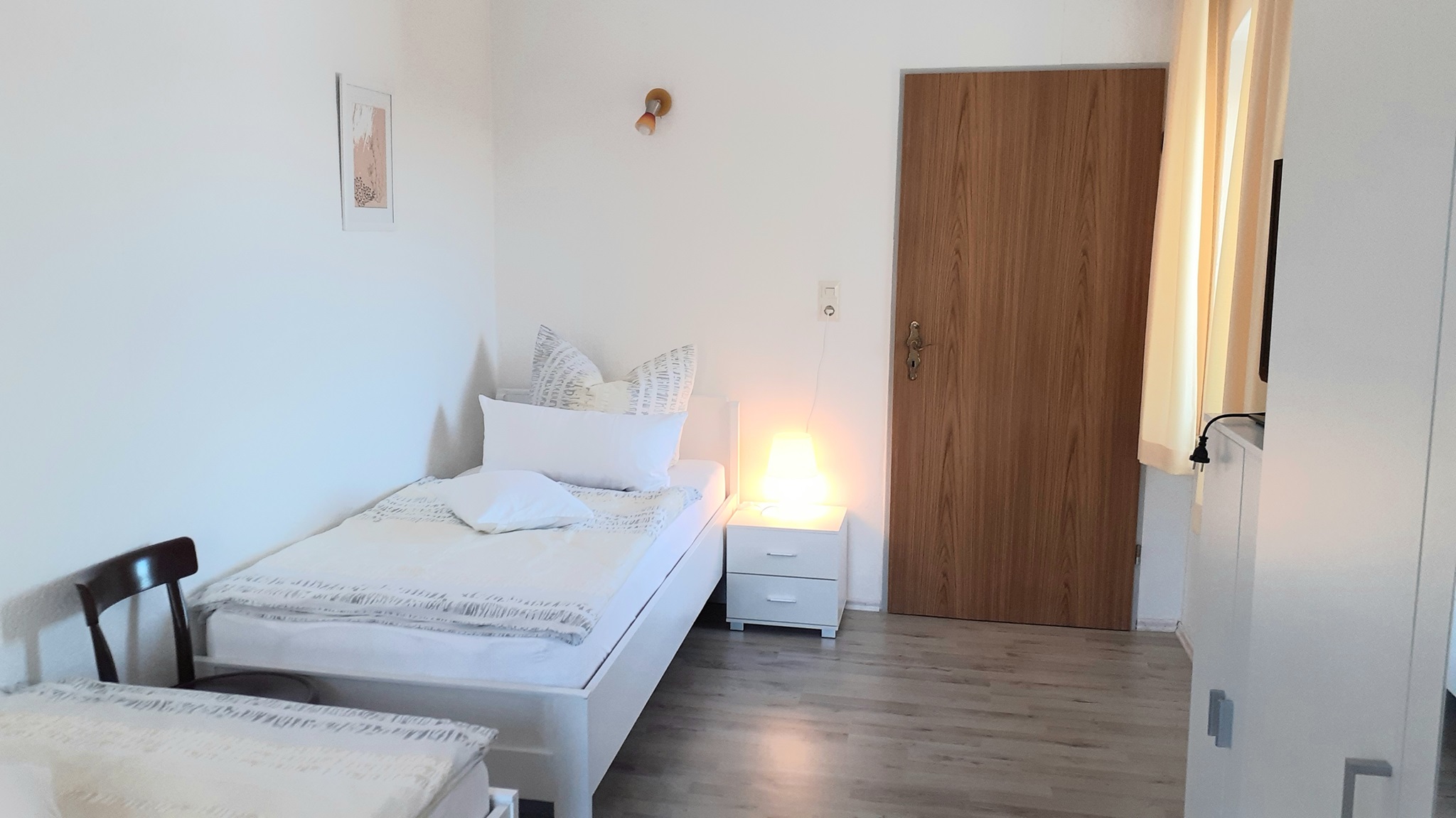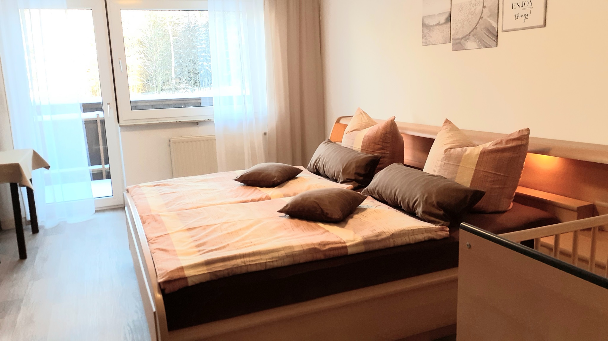 Die Wohnung hat drei Schlafzimmer wovon eines mit einem Doppelbett (180/200)und einem Kinderbett ausgestattet ist und davor ist ein kleiner Balkon mit Blick auf den Wald. Das zweite Schlafzimmer ist ein Einbettzimmer (90/200) mit Waschbecken. Das dritte Schlafzimmer ist mit hintereinander stehenden Betten (90/195 unten offen) ausgestattet die nicht zusammengestellt werden können. Zur Erstausstattung gehören Bettwäsche und Handtücher.