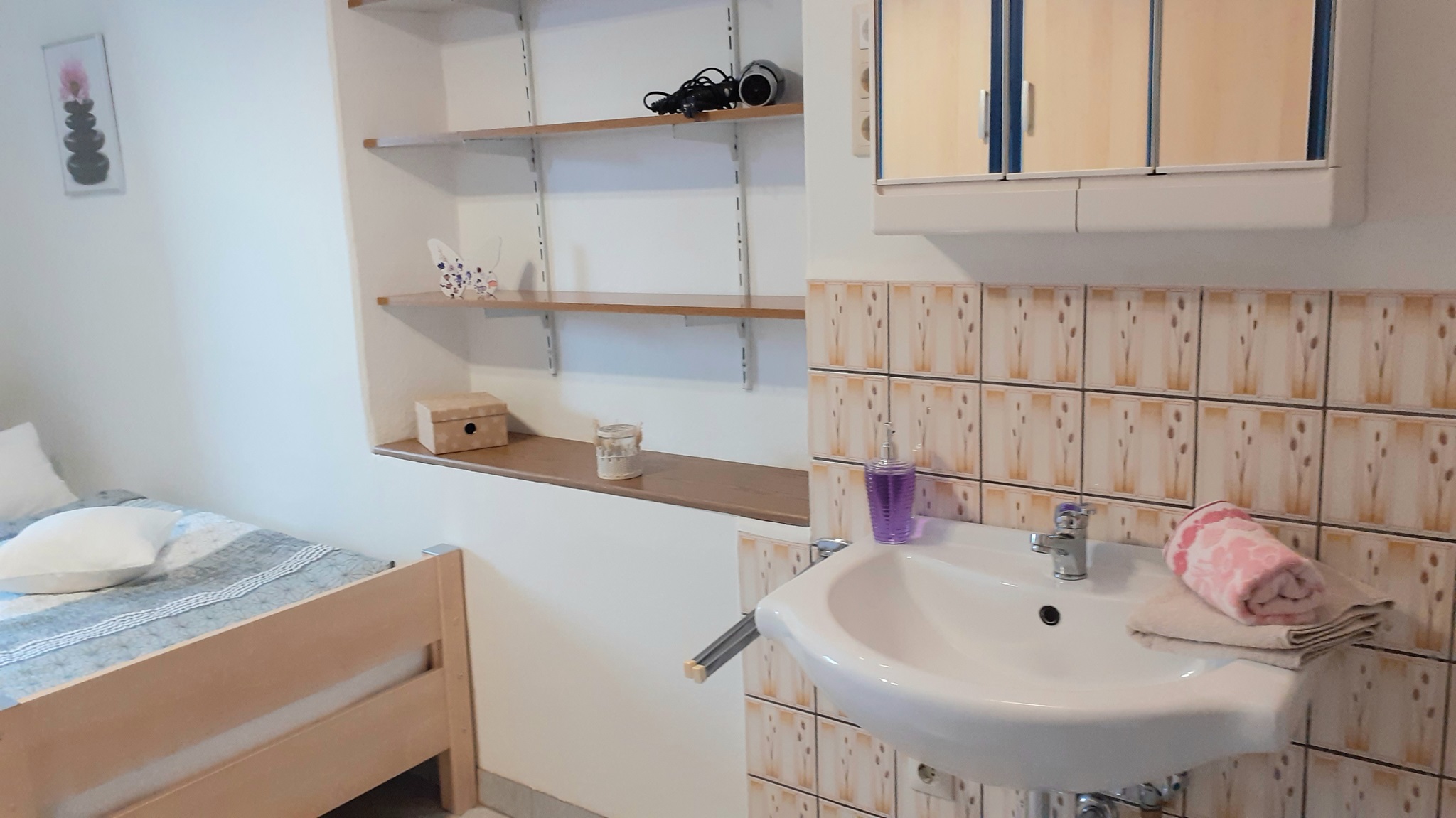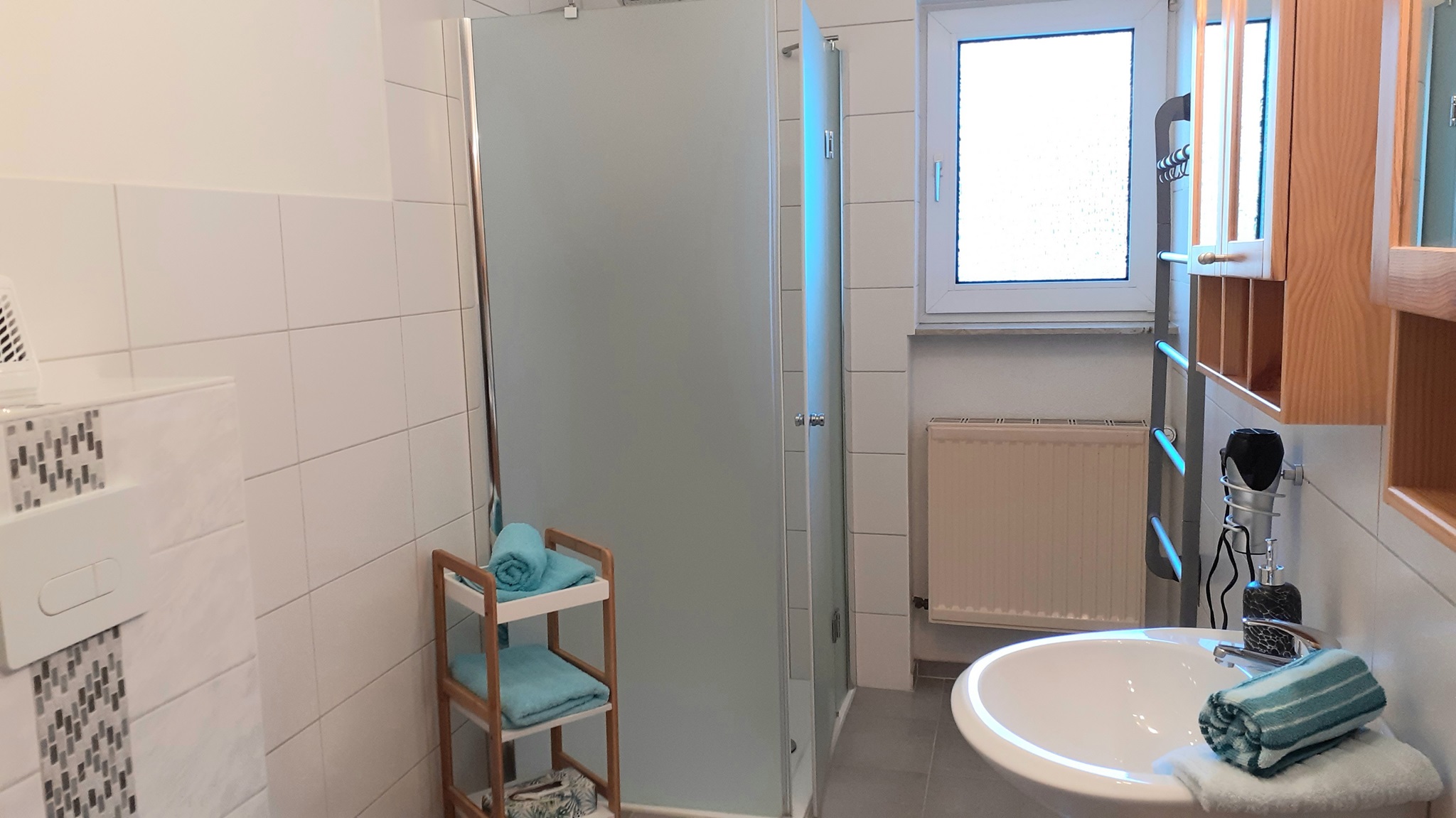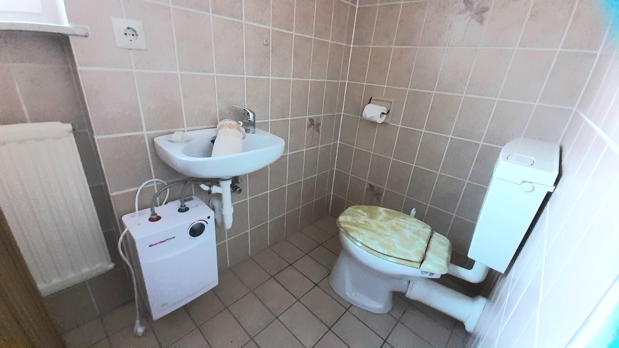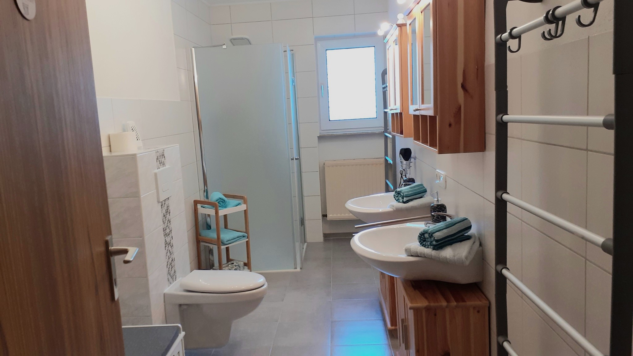 Ein Bad mit Dusche, WC, Clopapier, zwei Waschbecken, Waschmaschine und Waschpulver sind vorhanden. Ein weiteres WC befindet sich im Flur außerhalb der Wohnung.