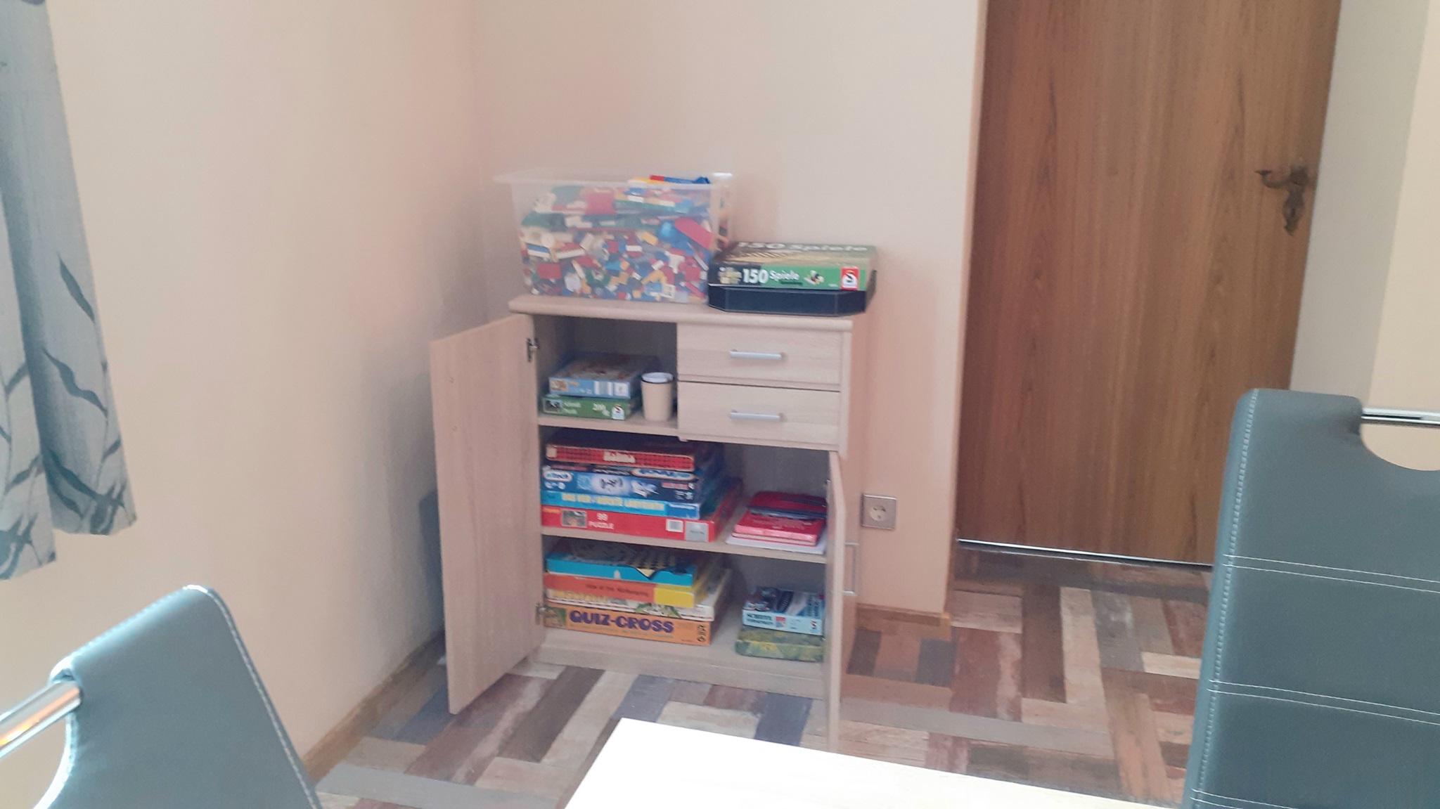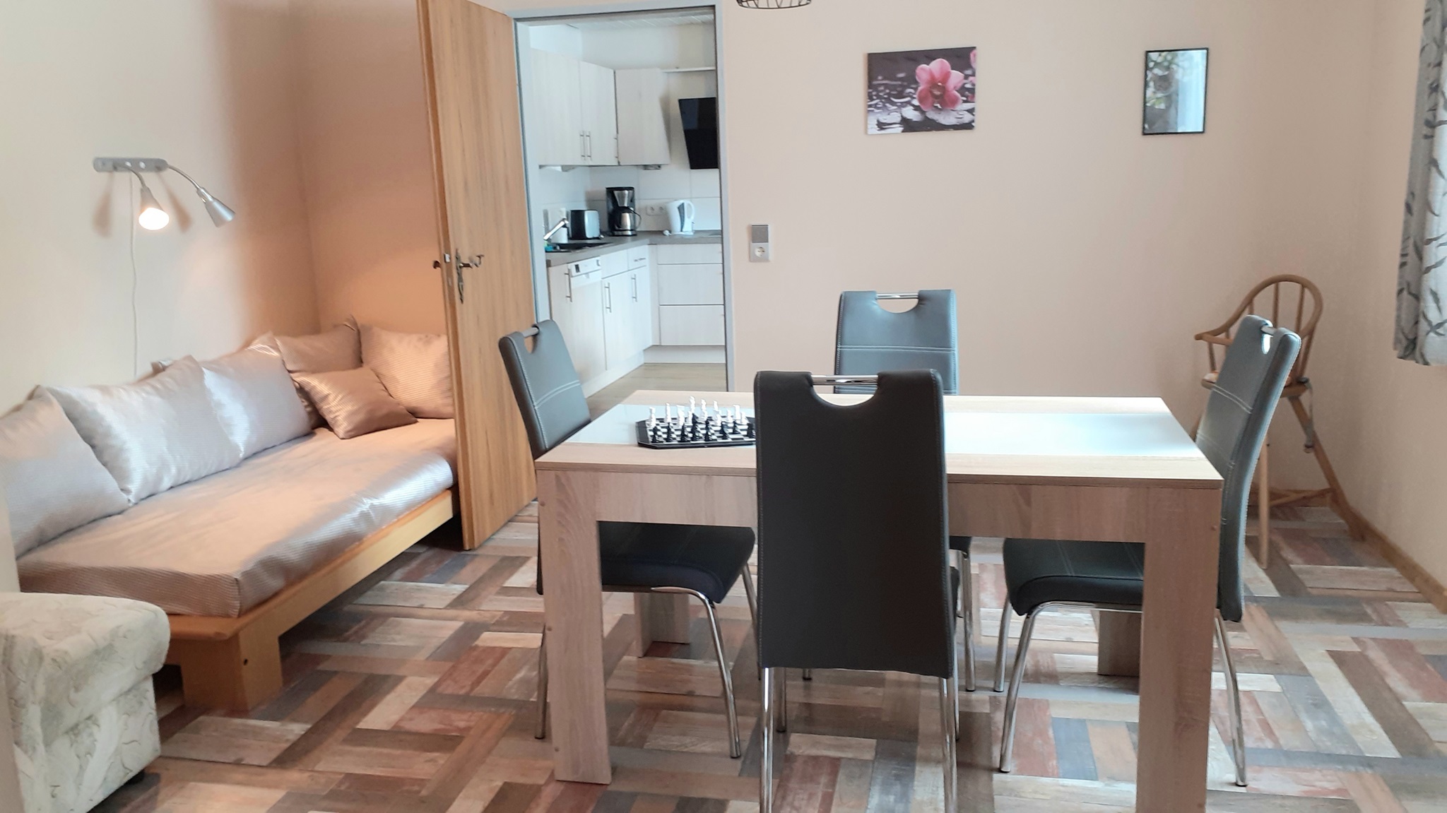 Die Wohnung(125qm) hat einen separaten Eingang. Sie besteht aus einer Küche mit Ausgang zur überdachten Terrasse(28 qm), einem Spiel-und Lesezimmer in welchem noch ein Bett zur Verfügung gestellt werden Kann. Das Wohnzimmer ist mit Eckcouch und Fernseher(SAT) ausgestattet.