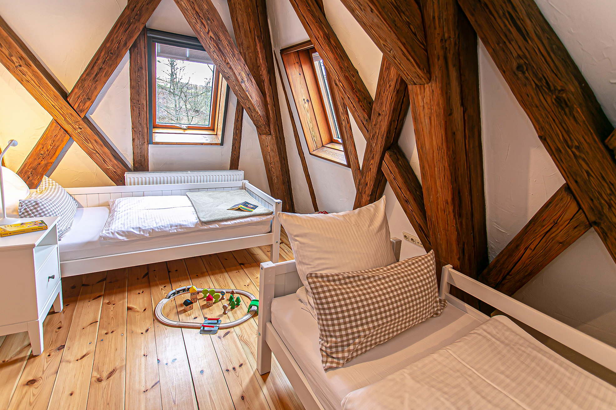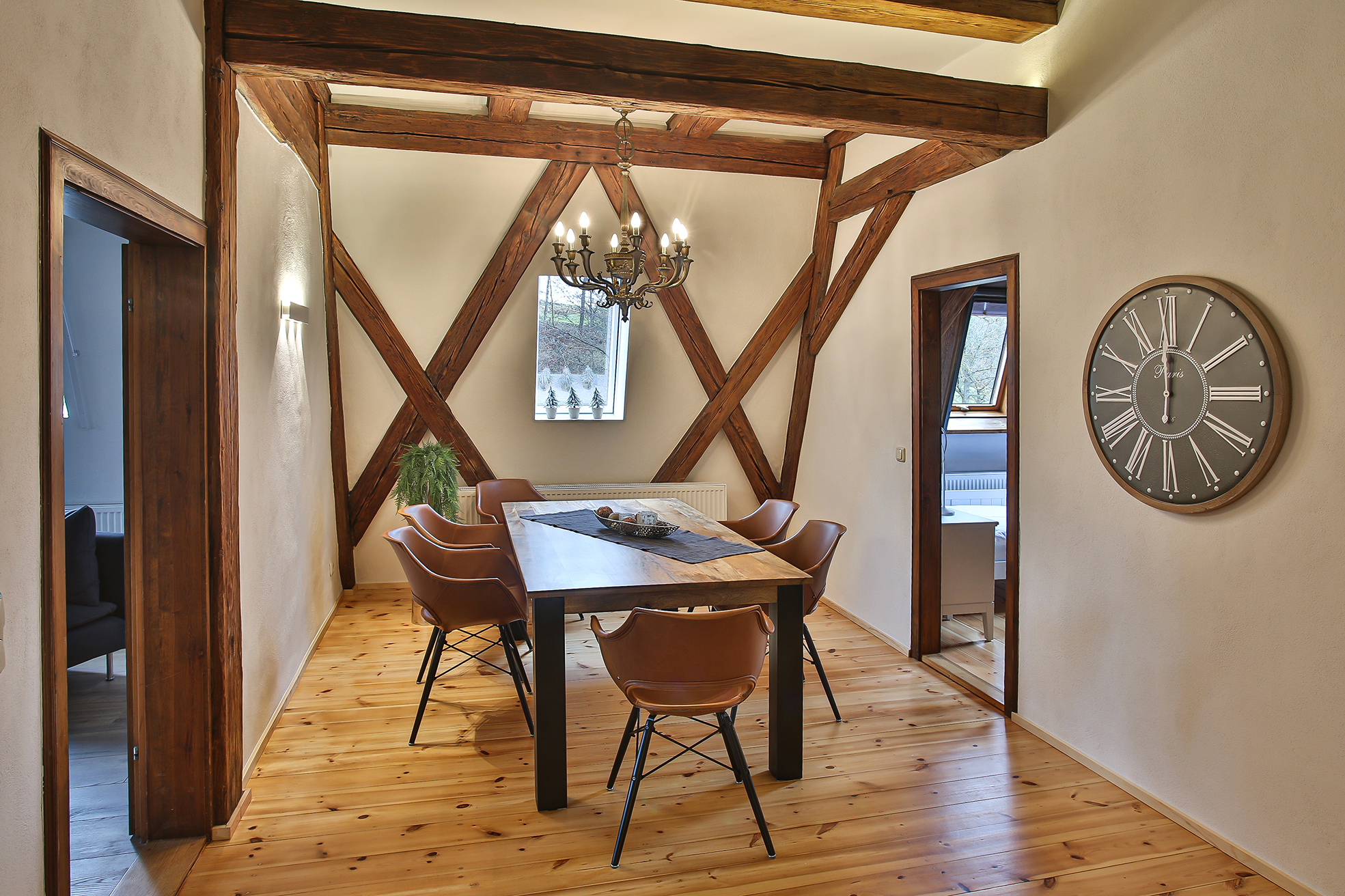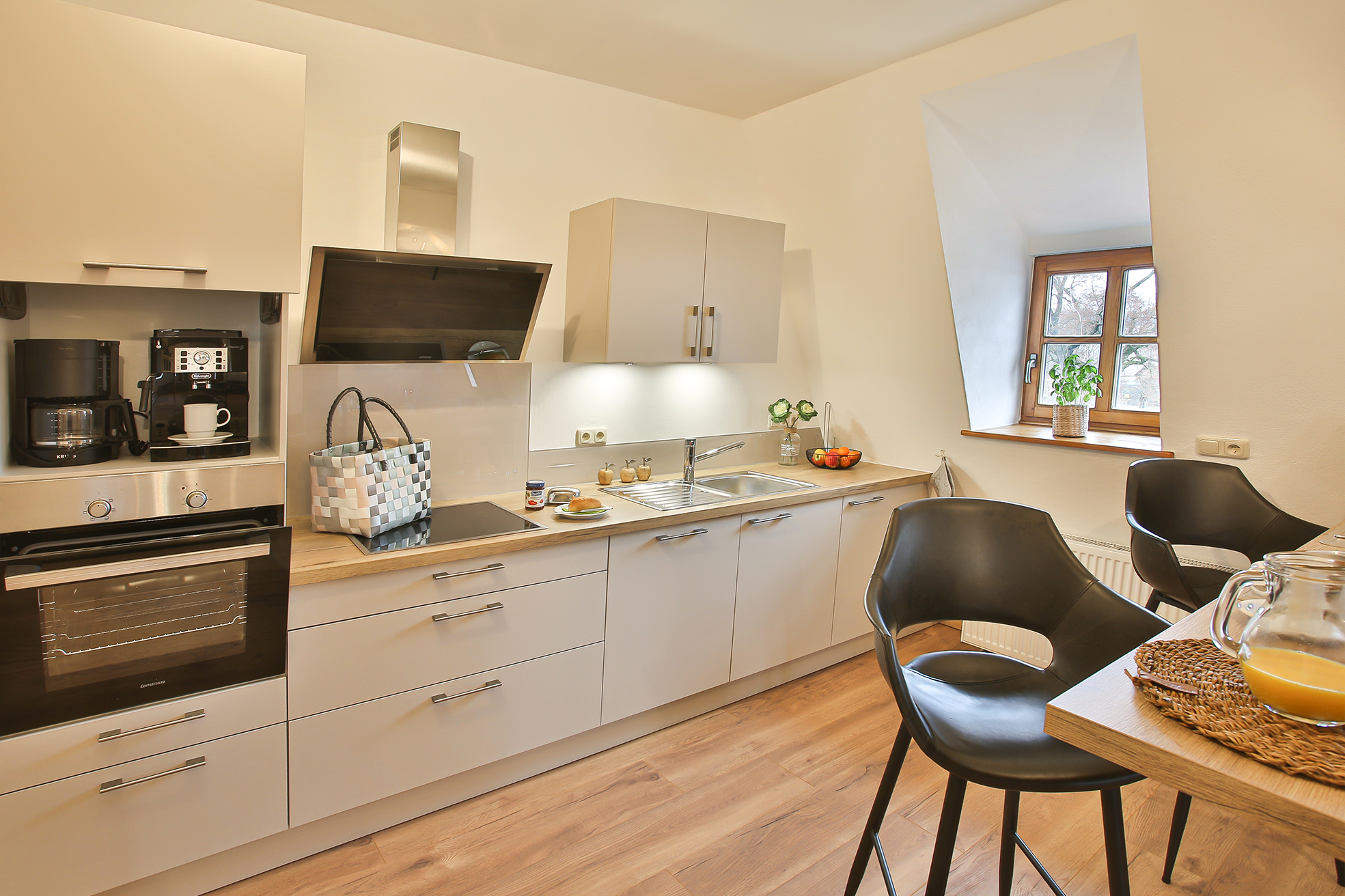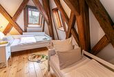 Ferienwohnung Klosterloft bietet für 1-6 Personen Platz und hat 140m². Es gibt ein DZ/TV, ein Zweibettzimmer, ein Loftzimmer mit zwei Einzelbetten. Wohnküche mit gemütlicher Essecke und Sofa /TV, Esszimmer mit großem Tisch, 1 Dusche/WC, 1 WC. Küche ist ausgestattet mit Induktionsherd, Backofen, Spülmaschine, Kühlschrank mit Gefrierfach, Toaster, Wasserkocher, Kaffeevollautomat. Bettwäsche und Handtücher sind vorhanden. Kostenlose Kinderausstattung auf Anfrage