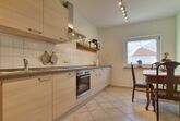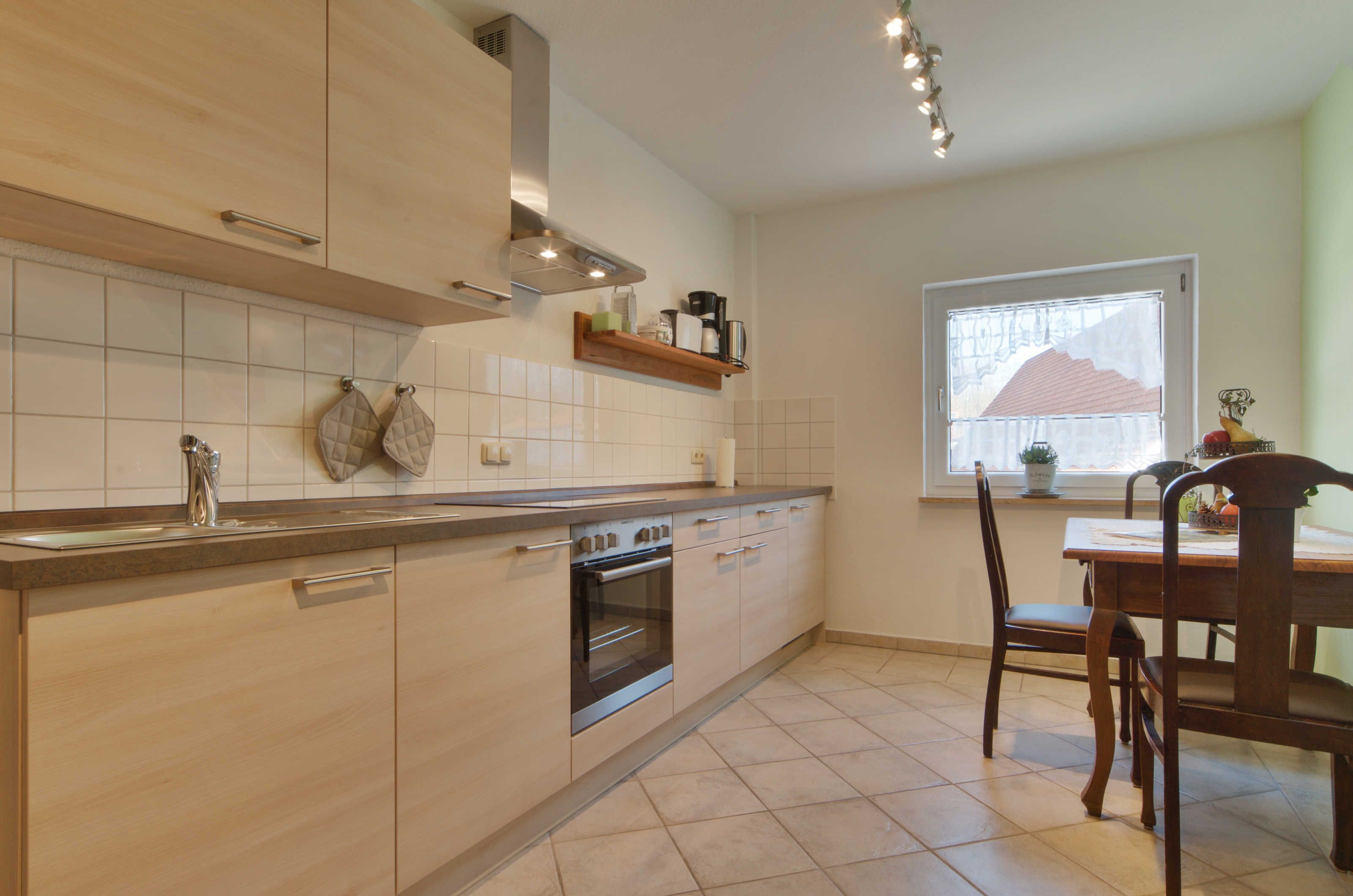 Komplett eingerichtete Küche mit Elektroherd, Kühlschrank , Kaffeemaschine, Wasserkocher, Toaster, Eierkocher, Geschirr, Besteck, Töpfe