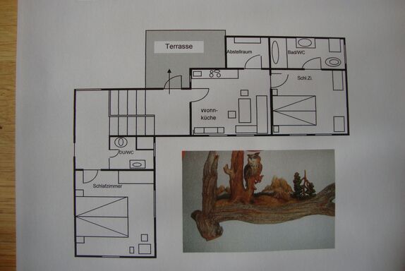 gemütl.Wohnküche, perfekt ausgestattet, 1 D/bettzi.mit Bad/WC, 1 D/bettzi.mit DU/WC (dieses Zi.liegt eine halbe Etage höher, ist nicht in die Wohnung integriert. Preis für 2 Pers. ab 60 €.