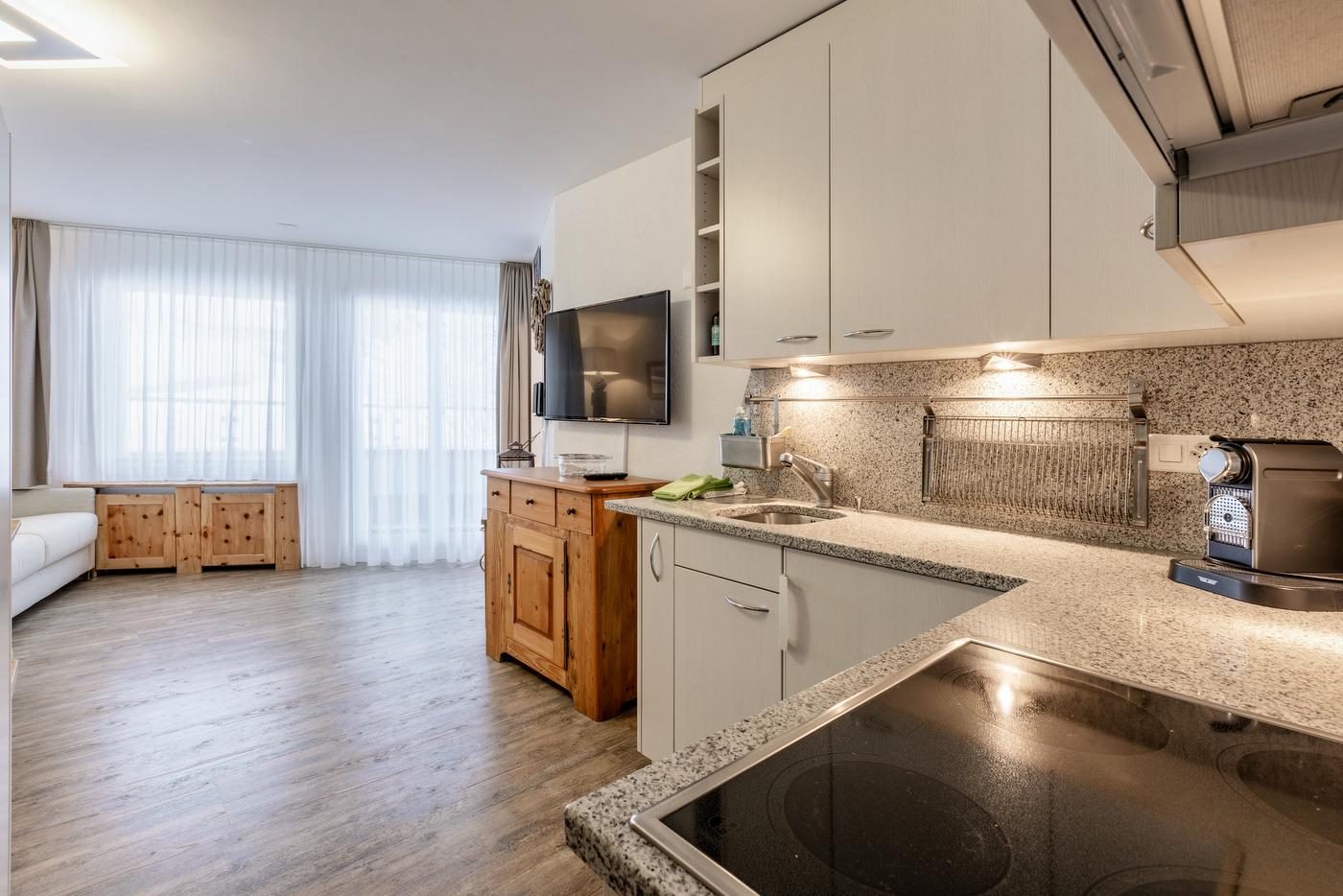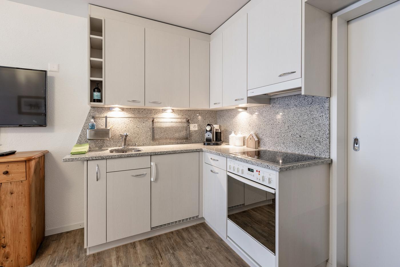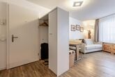 Auf dem kleinen, aber ruhigen Balkon mit Sitzgelegenheit kann man den Abend ausklingen lassen. Die kleine Küche verfügt über einen Backofen, einen Kühlschrank, eine Kaffeemaschine und vieles mehr. Im Schlafzimmer steht neben einer kleinen Garderobe auch ein grosser Kleiderschrank zur Verfügung.
