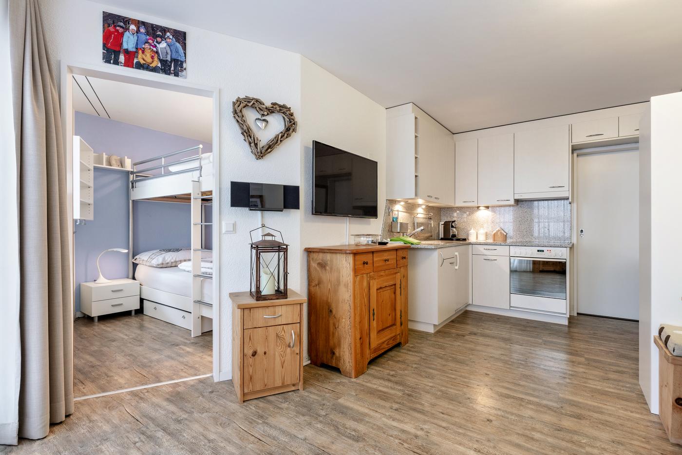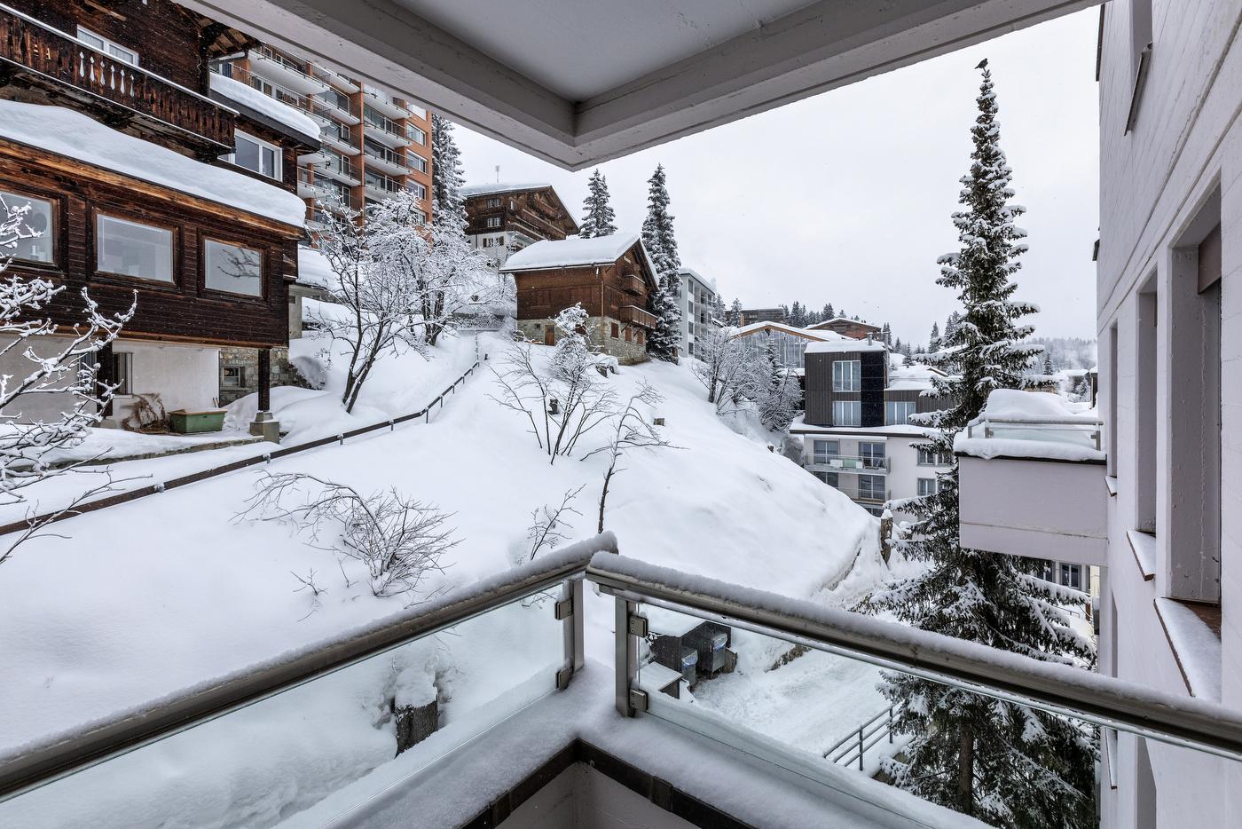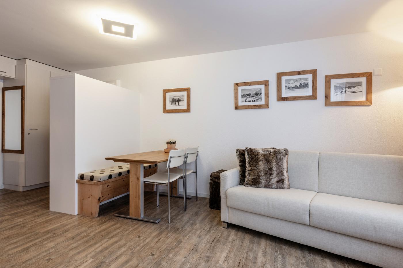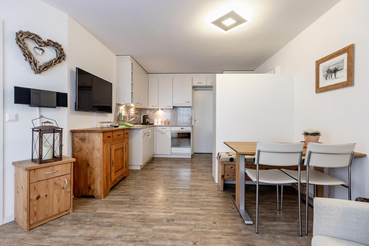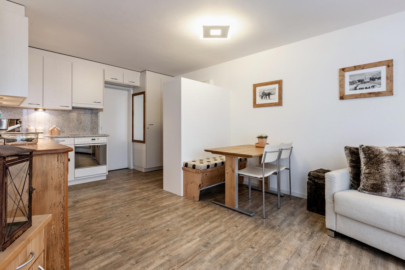 Mitten im Dorfzentrum von Arosa befindet sich im 5. Stock, im Hais Lorez, diese moderne 2. Zimmer-Wohnung mit Balkon. Sie bittet Platz für 3-4 Personen (2 Erwachsenen, 2 Kind) und ist eine Nichtraucher-Wohnung. Einkaufsmöglichkeiten sind direkt im Haus und in unmittelbarer Nähe. Der Gratis-Ortsbus hält direkt vor dem Hauseingang. Die Wohnung umfasst 1 Schlafzimmer mit einem grossen Kajütenbett und eine offene Küche mit Wohnzimmer, einen Essbereich und ein Badezimmer. Der Ski-/Veloraum und die Waschmaschine (Geldmünzautomat) können mitbenutzt werden.
