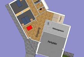 Die obere Wohnung im 2. Stock (2 Doppelzimmer für 4 Personen) und die untere Wohnung im EG und 1. Stock (5 Doppelzimmer für 9 Personen) können zusammen oder separat gemietet werden.