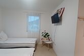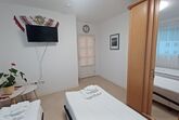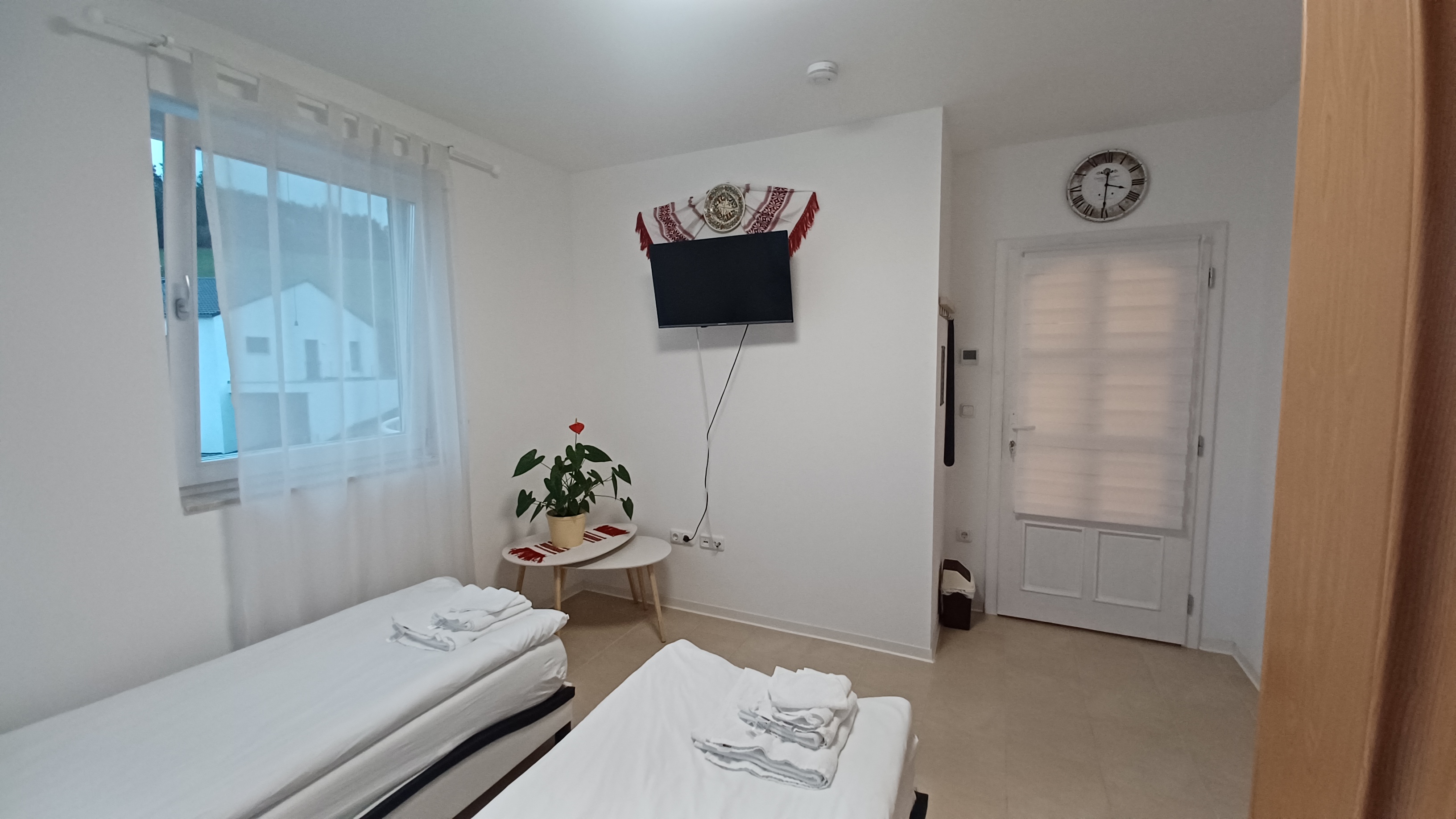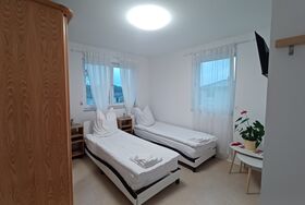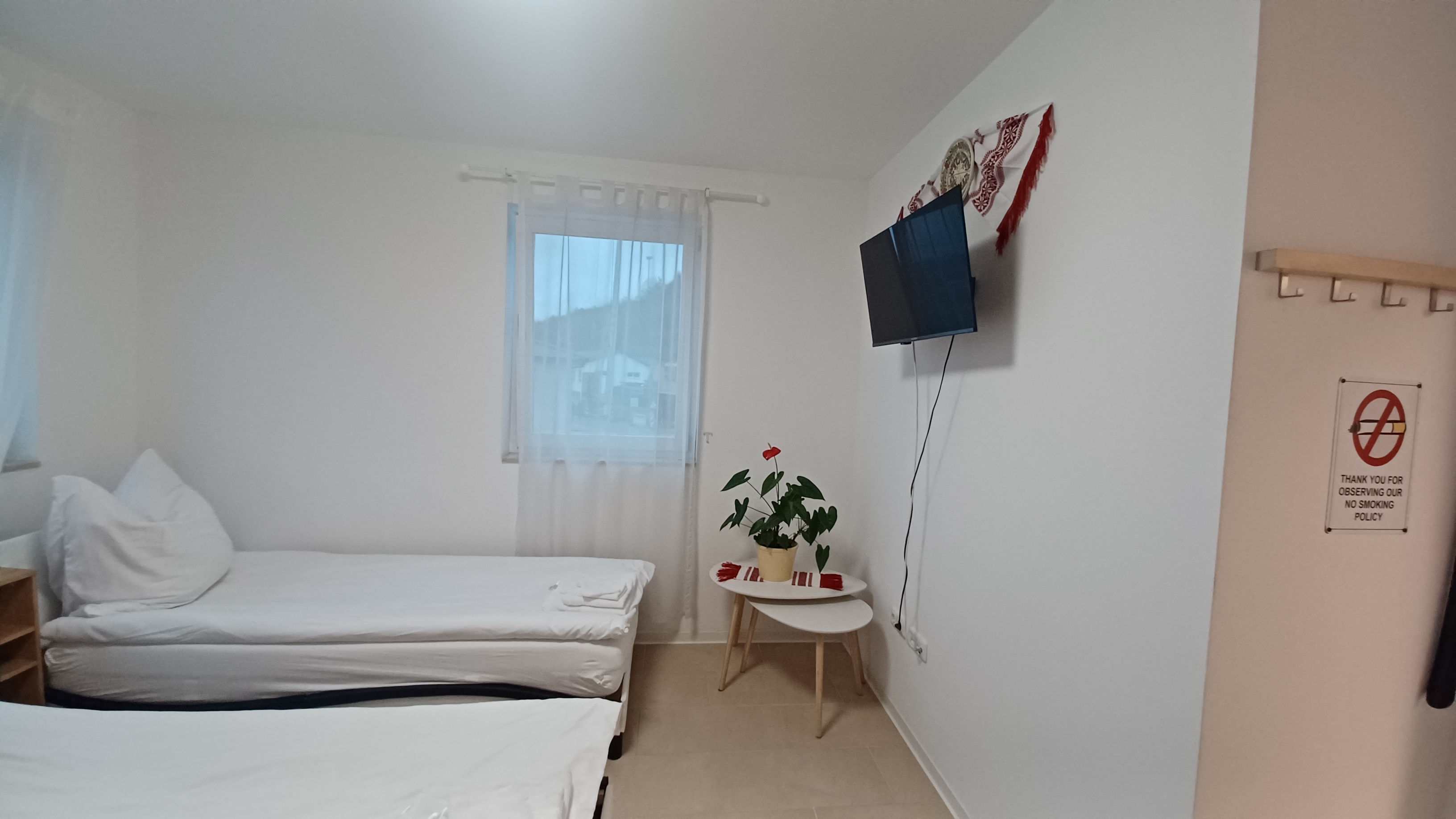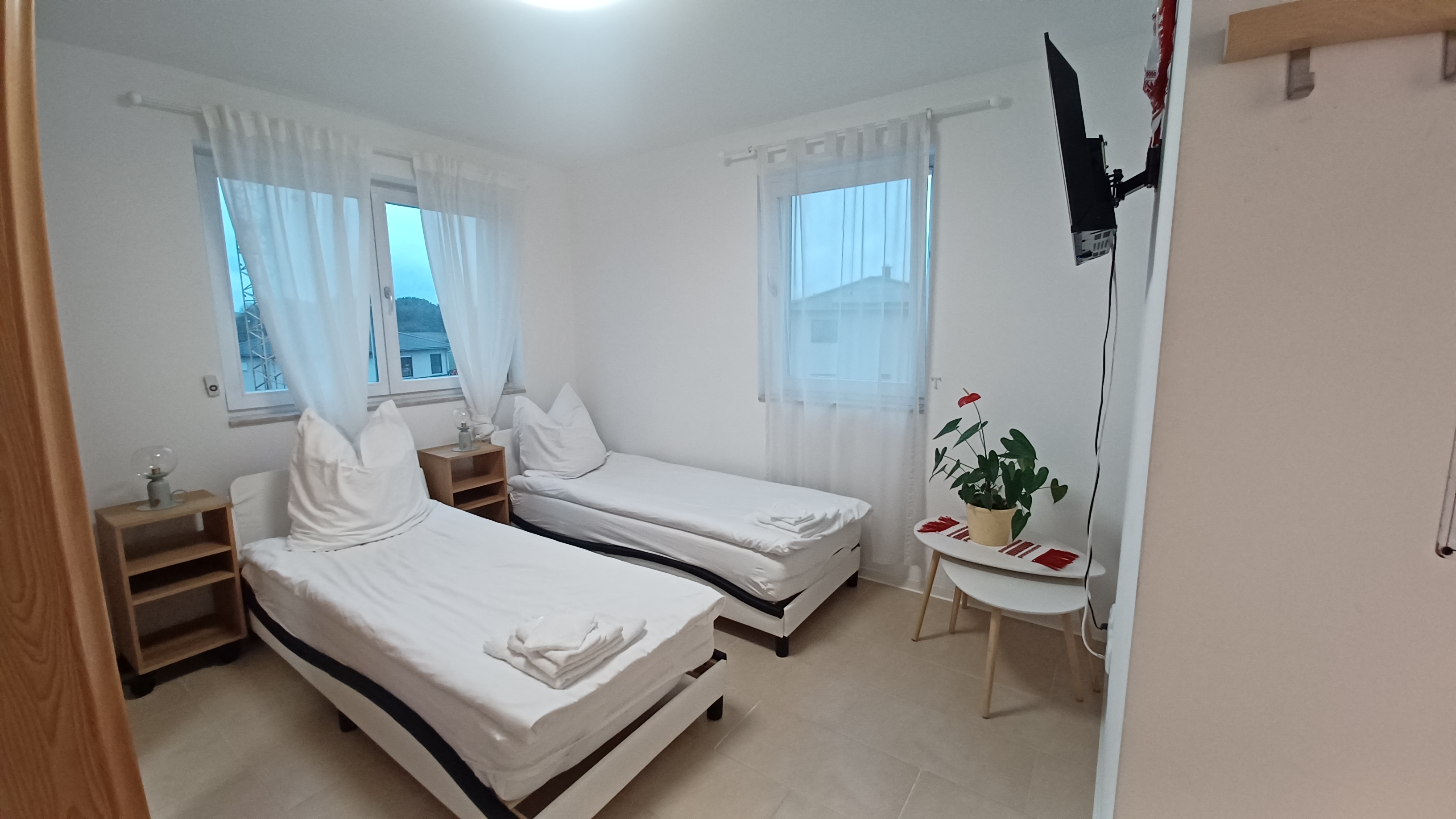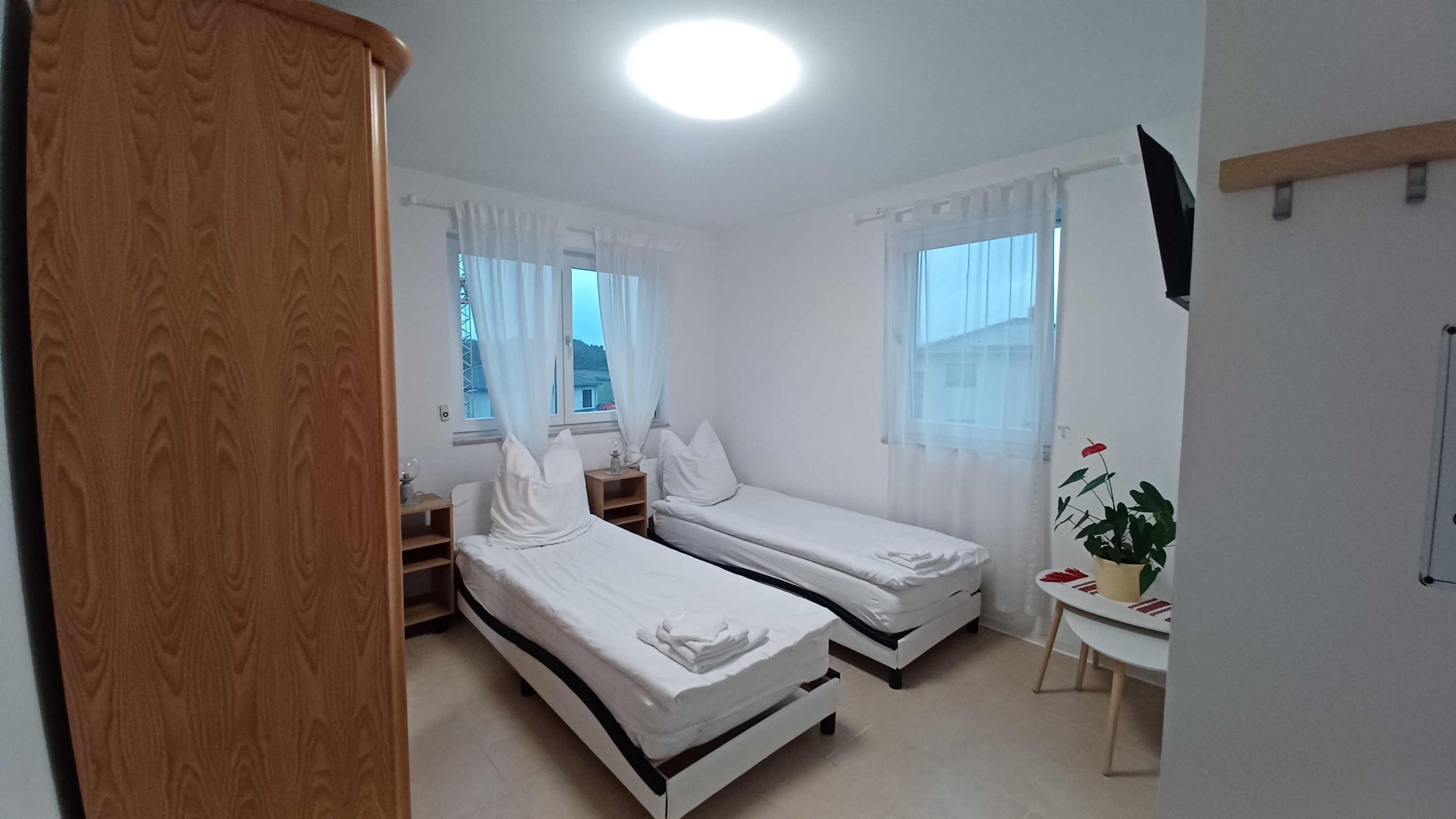 Das Doppelzimmer bietet Platz für zwei Personen und ist mit zwei Einzelbetten ausgestattet. Die Küche und das Wohnzimmer stehen allen Gästen zur gemeinsamen Nutzung offen. Das Badezimmer mit Dusche und WC wird gemeinschaftlich mit den Gästen des zweiten Doppelzimmers geteilt.