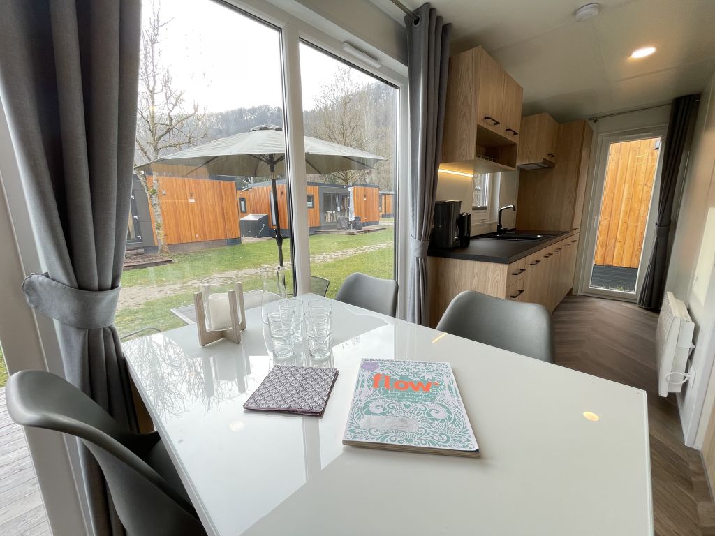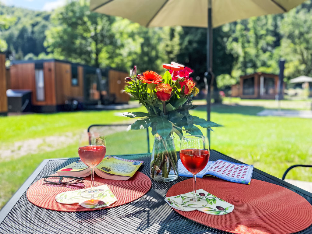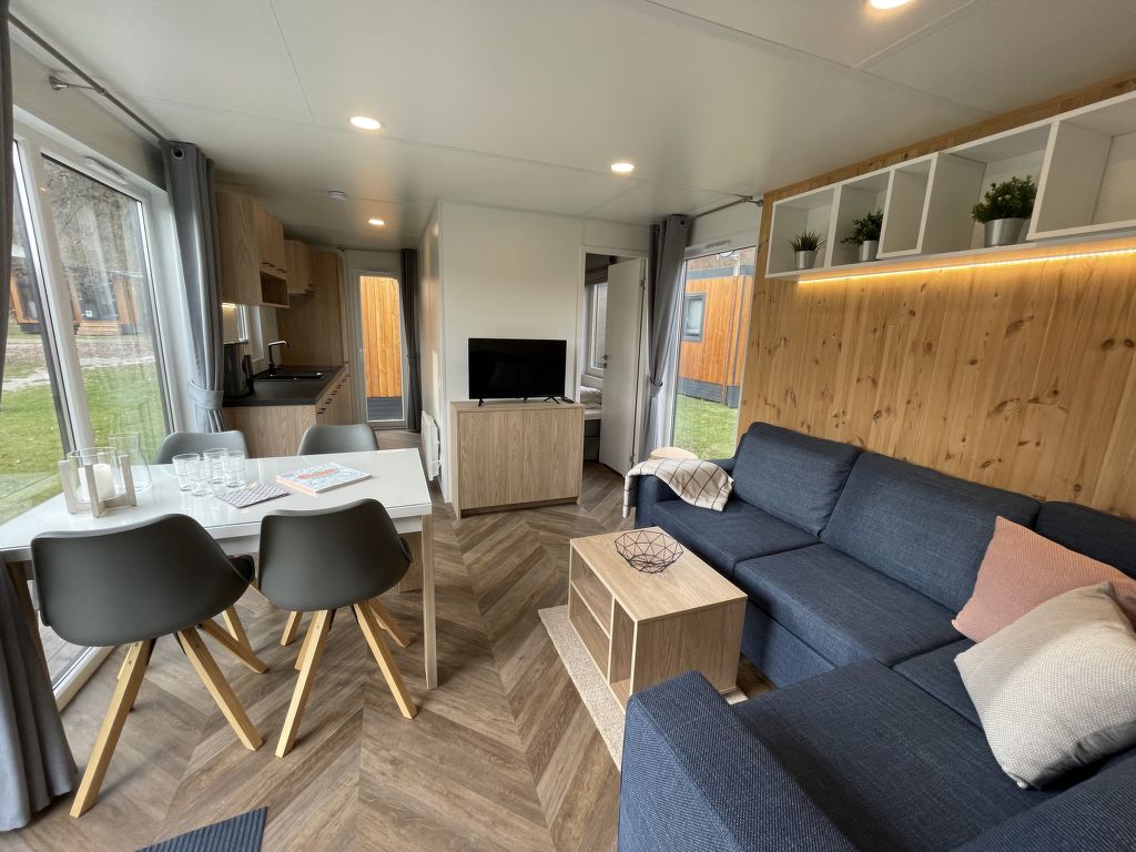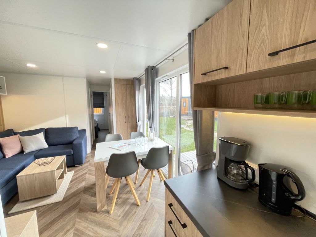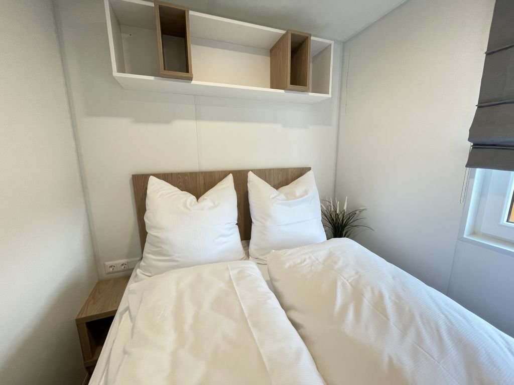 Tiny Haus Xandra, 3-Zimmer-Mobilheim 32 m2. Gemütlich eingerichtet: Wohn-/Schlafzimmer mit (120 cm, Länge 170 cm), Sat-TV. Ausgang zur Terrasse. 1 Zimmer mit 1 franz. Bett (140 cm, Länge 200 cm). 1 Zimmer mit 2 Betten (80 cm, Länge 200 cm). Offene Küche (4 Glaskeramikplatten, Wasserkocher, elektrische Kaffeemaschine). Dusche/WC. E-Heizung. Kleine Terrasse. Terrassenmöbel. Parkplatz beim Haus. Bitte beachten: Nichtraucher-Haus. Maximal 1 Haustier/Hund erlaubt. Fahrradbox. DE8422.200.24