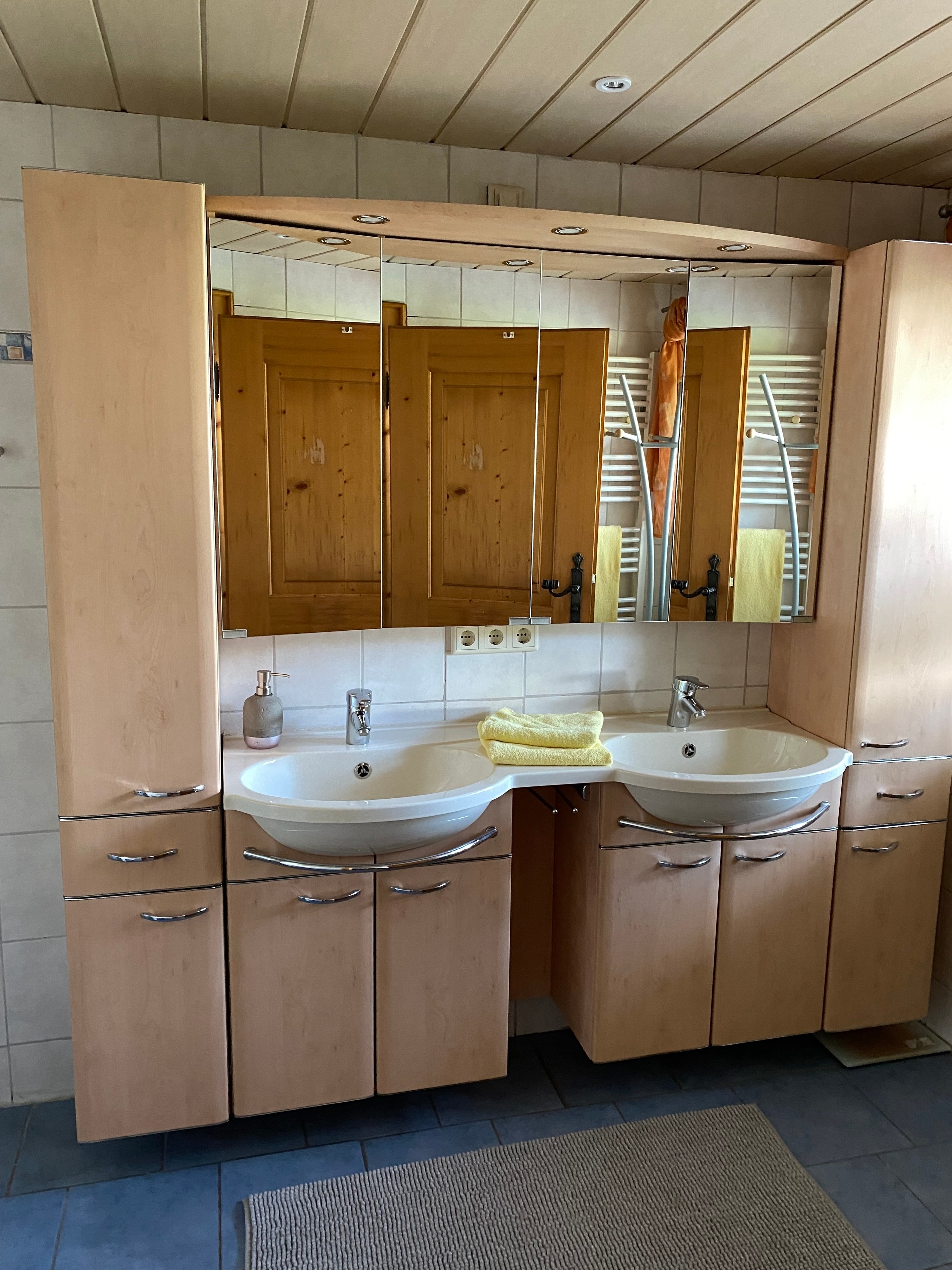 Im Erdgeschoß ist ein große Wohnküche ein Wohnzimmer und ein großes Bad noch. Die Wohnung ist sehr geräumig und gut ausgestattet.