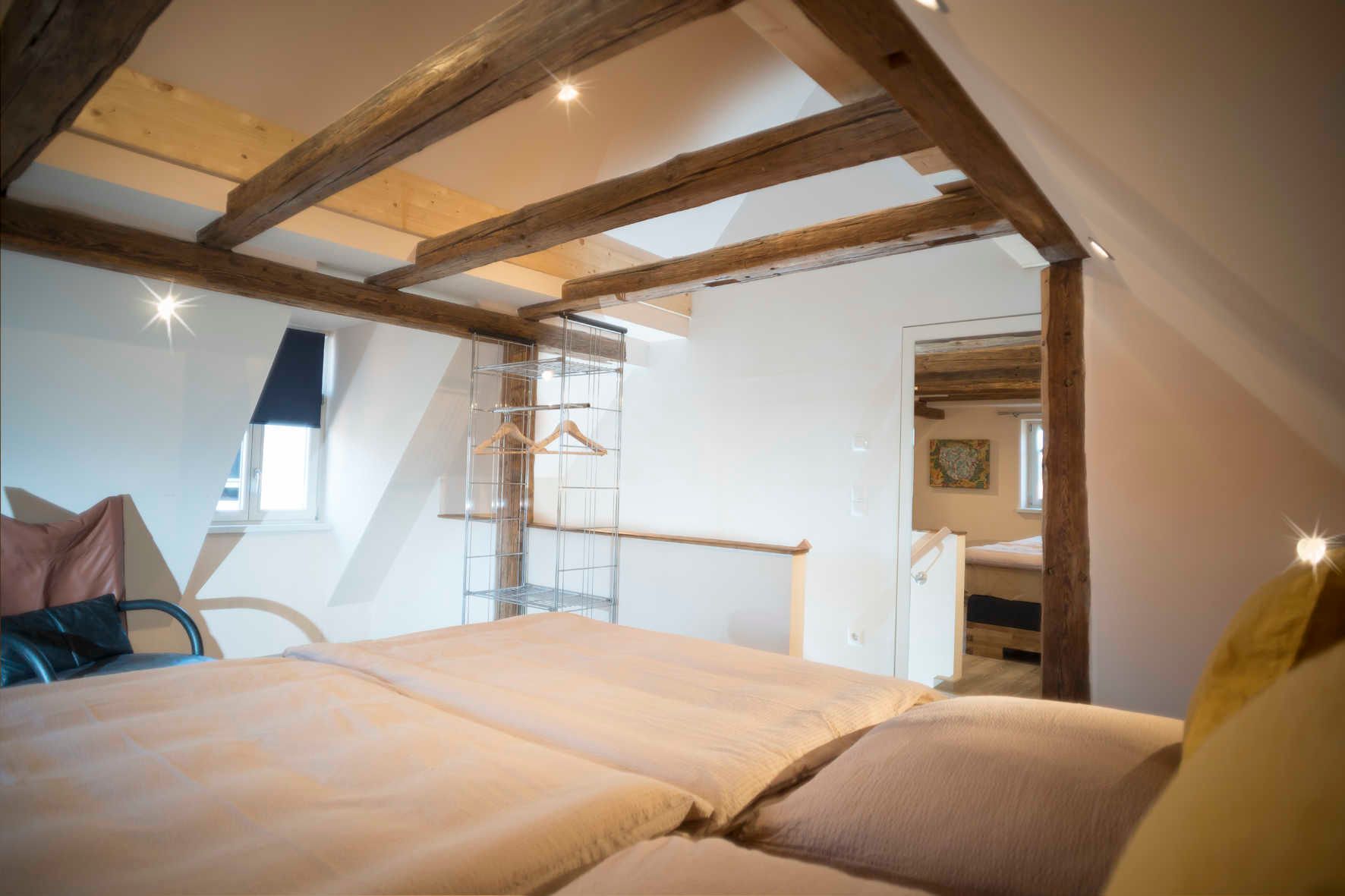 Unsere Deluxe-ApARTments bieten besonderes Flair und höchsten Ausstattungskomfort: Der TAUBENSCHLAG empfängt Sie mindestens auf 55 qm mit Pantryküche, Sitzecke, Lümmelcouch, einem großzügigen, sehr geräumigen tageslichtdurchflutetem Badezimmer und Alles, was man für den erholsamen Aufenthalt in historischem, komplett neu aufgebauten Fachwerk wünscht. Sie schlafen in den Maisonette-Suiten im DG unter offenem Fachwerk in hochkomfortablen Boxspringbetten und genießen eine außergewöhnliche Ruhe in ebensolchem Ambiente.