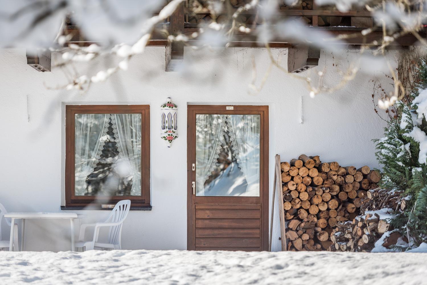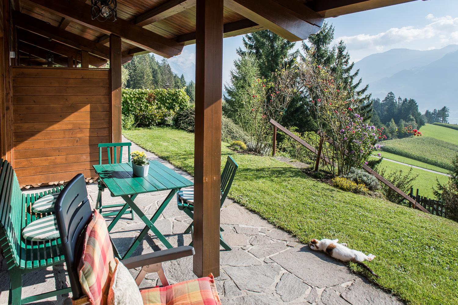 Im Aussenbereich Sitzmöglichkeit und Wiese mit herrlicher Talsicht