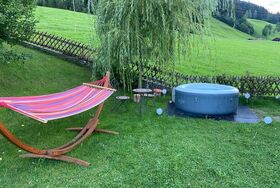 Der Garten mit Terrasse, Grillmöglichkeit und Whirlpool ist zur freien Verfügung.