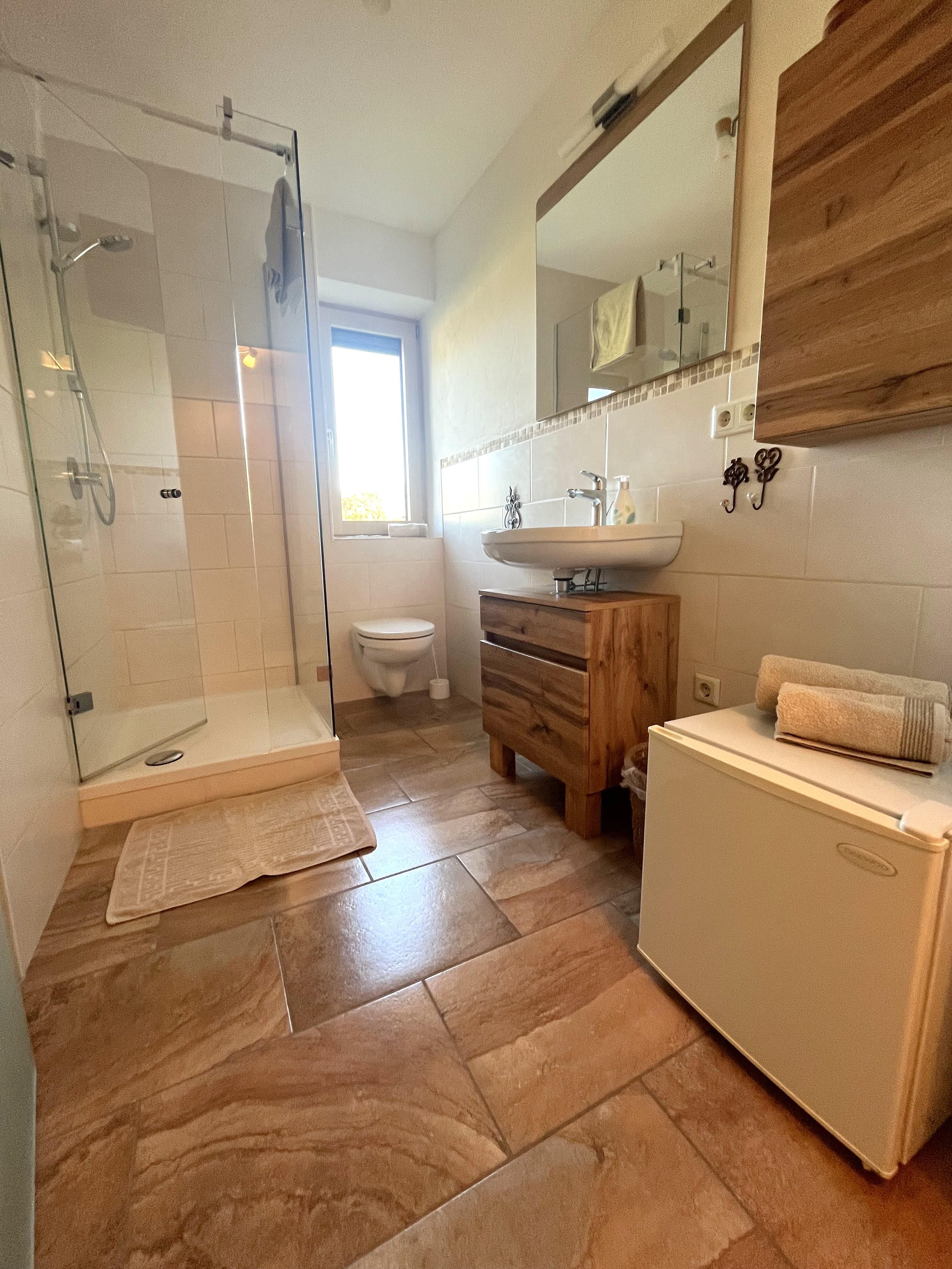 Dieses großzügige Zimmer mit Balkon liegt gartenseitig mit Blick auf unseren Obstgarten, den kleinen Naturteich und die Schwader Eisenstein-Kette. In der vorhandenen Kochnische können kleinere Gerichte bereitet werden. Die Balkonecke lädt zum Verweilen und Lesen ein.