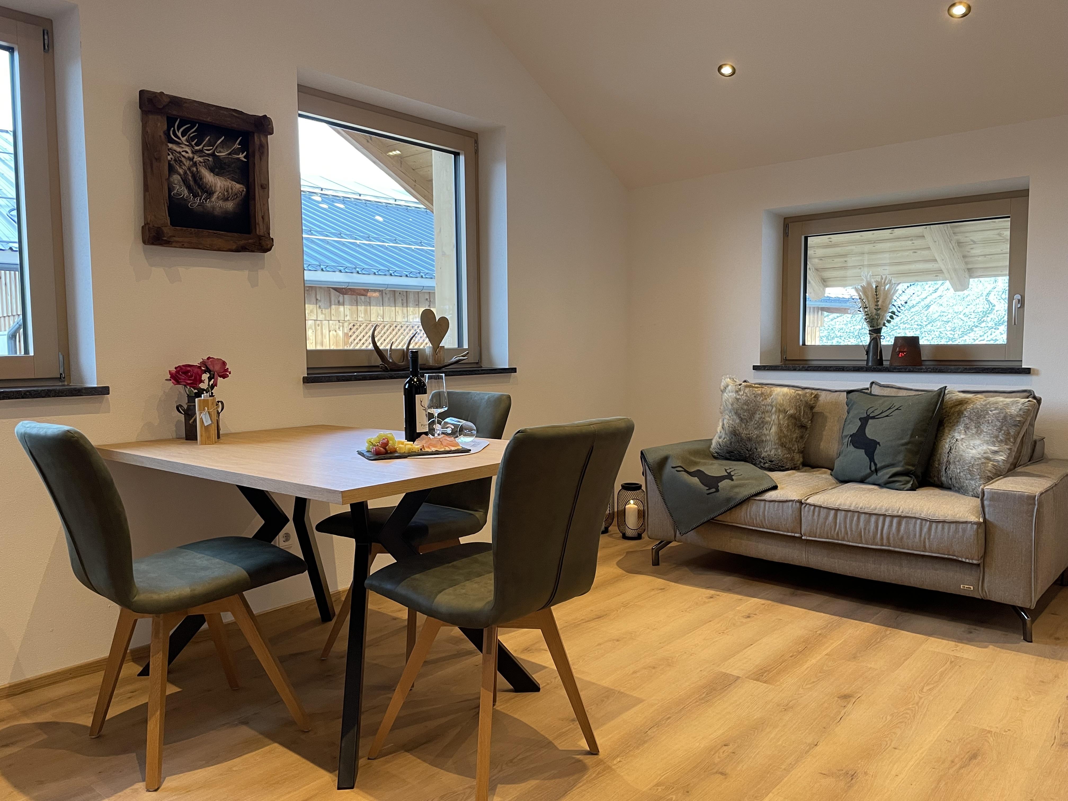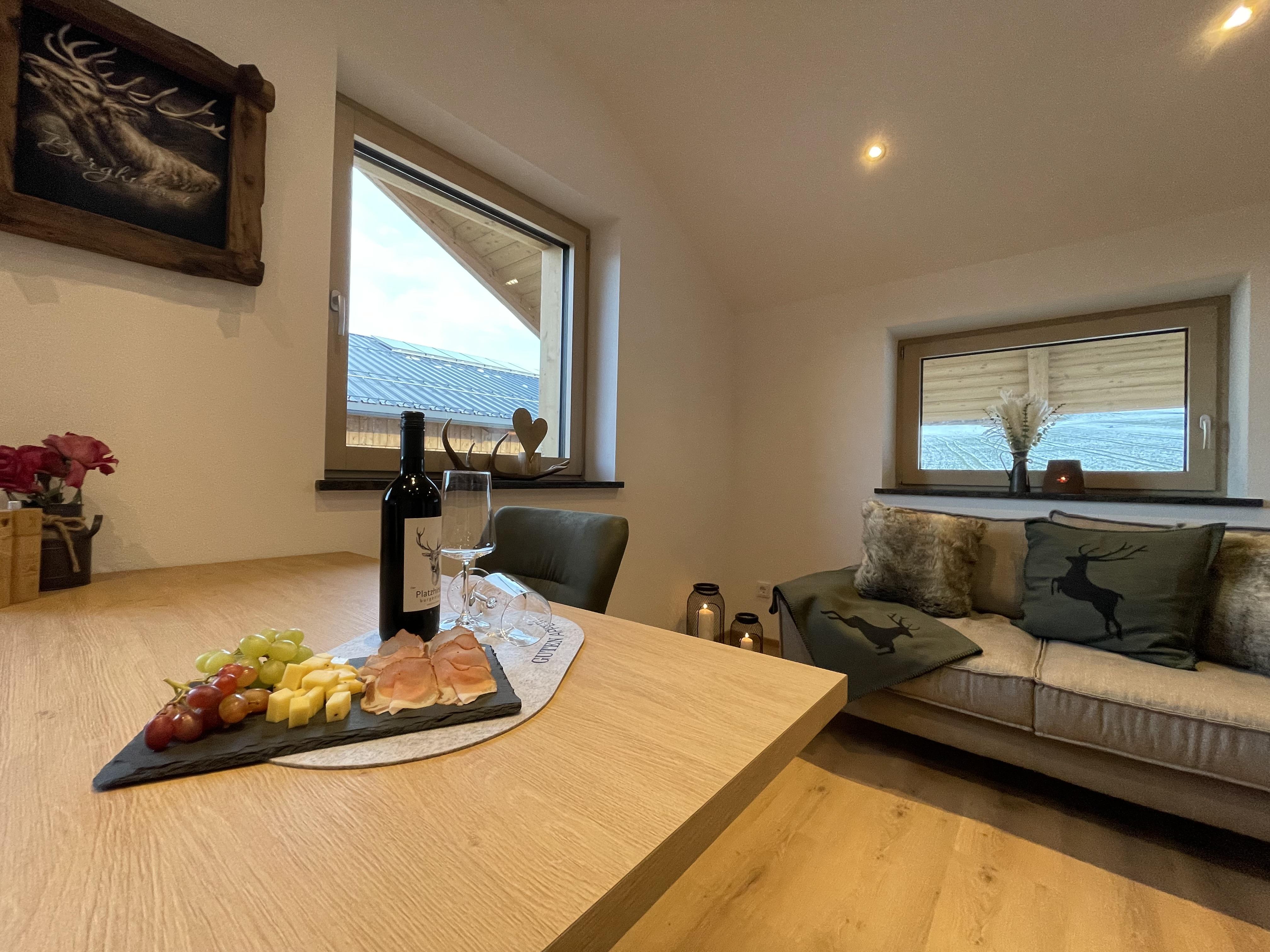 Unsere neu erbaute Ferienwohnung Wildschütz verfügt über eine gemütliche Wohnküche mit vollausgestateter Küche. Sowie über ein liebevoll eingerichtetes Schlafzimmer mit Boxspringbett und ein Badezimmer.