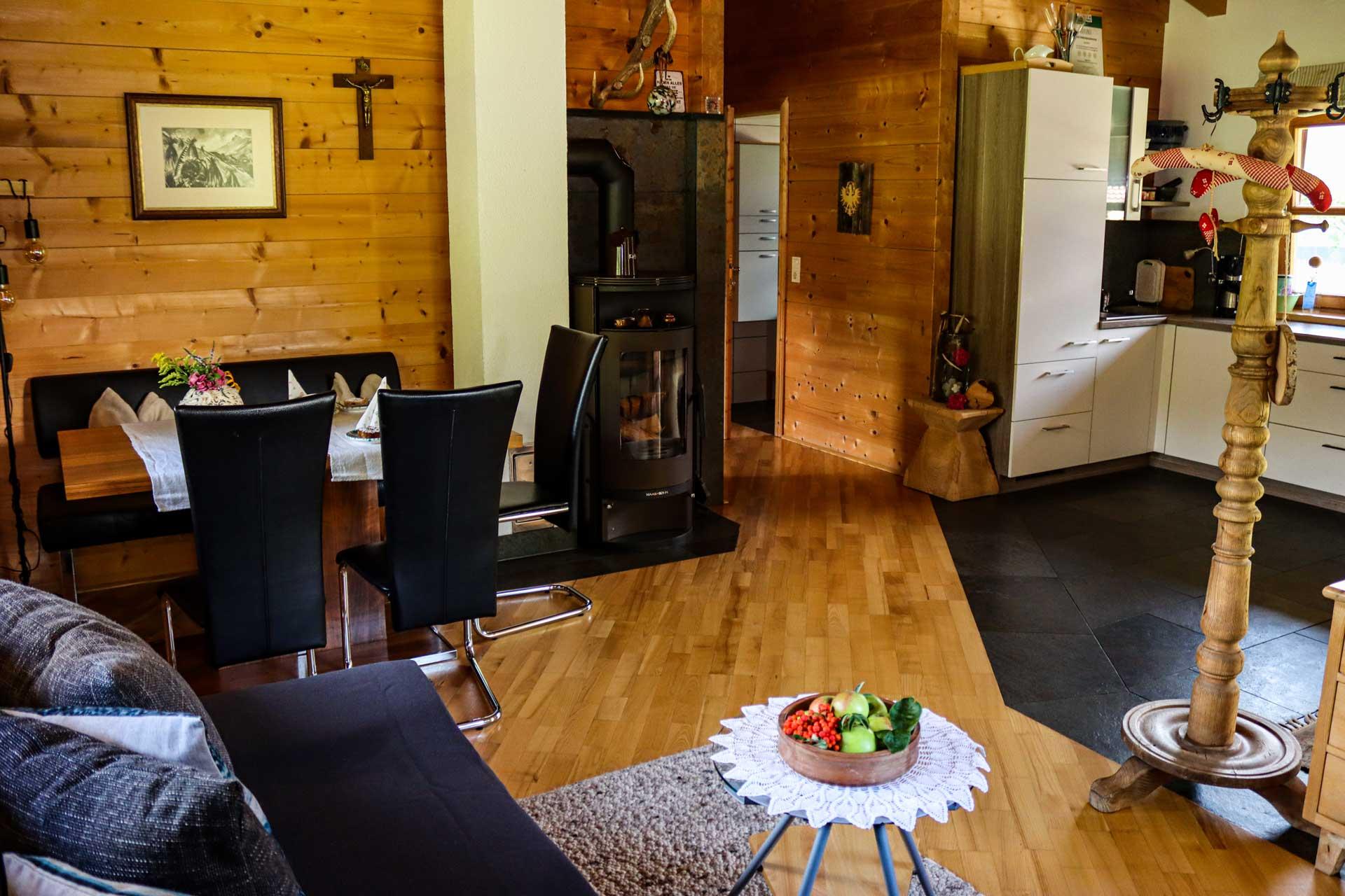 Auch der Wohnraum ist mit einer Zirbentäfelung versehen, bereits beim Eintreten ins Haus bemerkt man ihren angenehmen Duft.