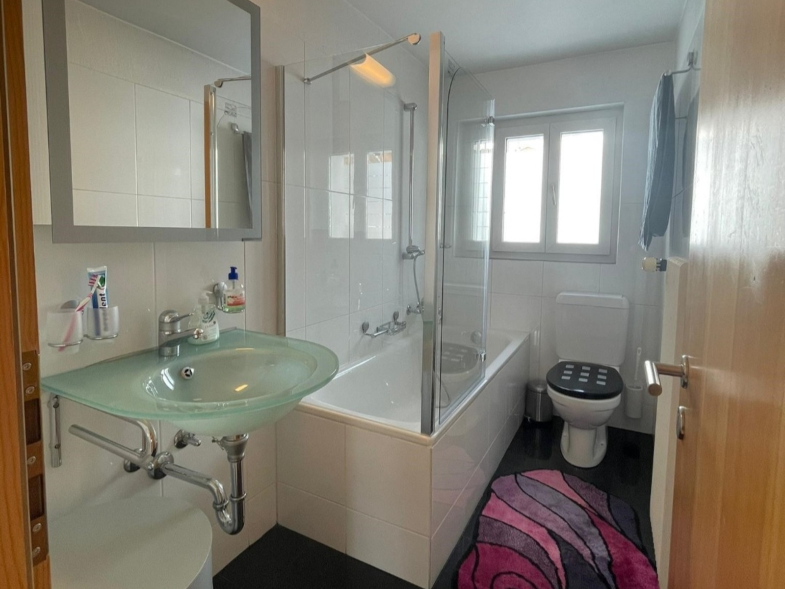 Das Badezimmer verfügt über eine Badewanne und ein WC/Lavabo. Zusätzliche Utensilien wie Haarföhn und Toilettenpapier stehen zur Verfügung. Die Frotteewäsche ist vorhanden und im Preis inbegriffen.