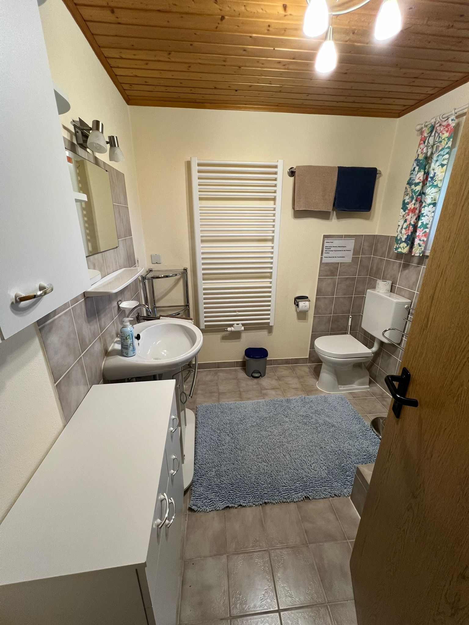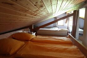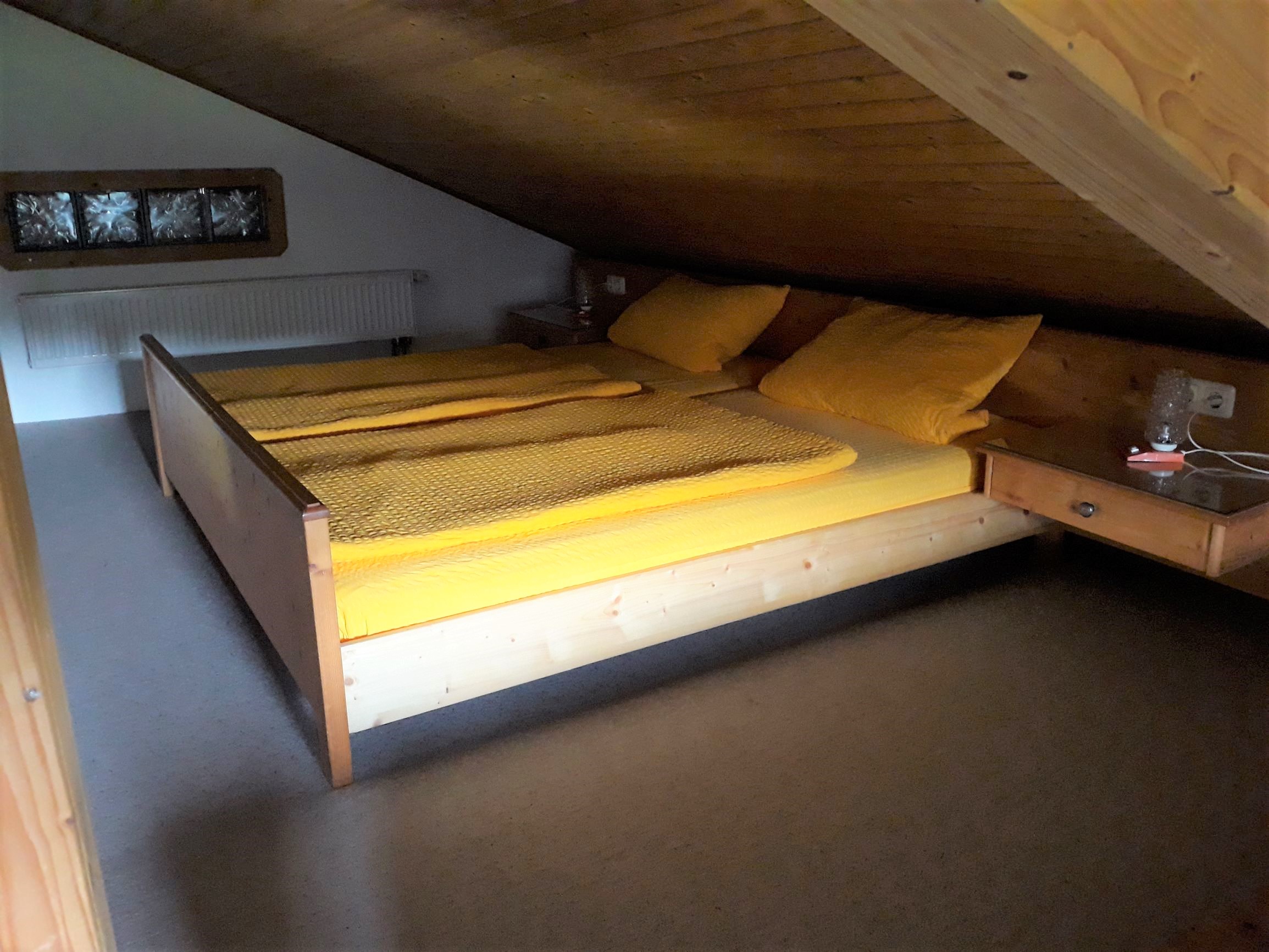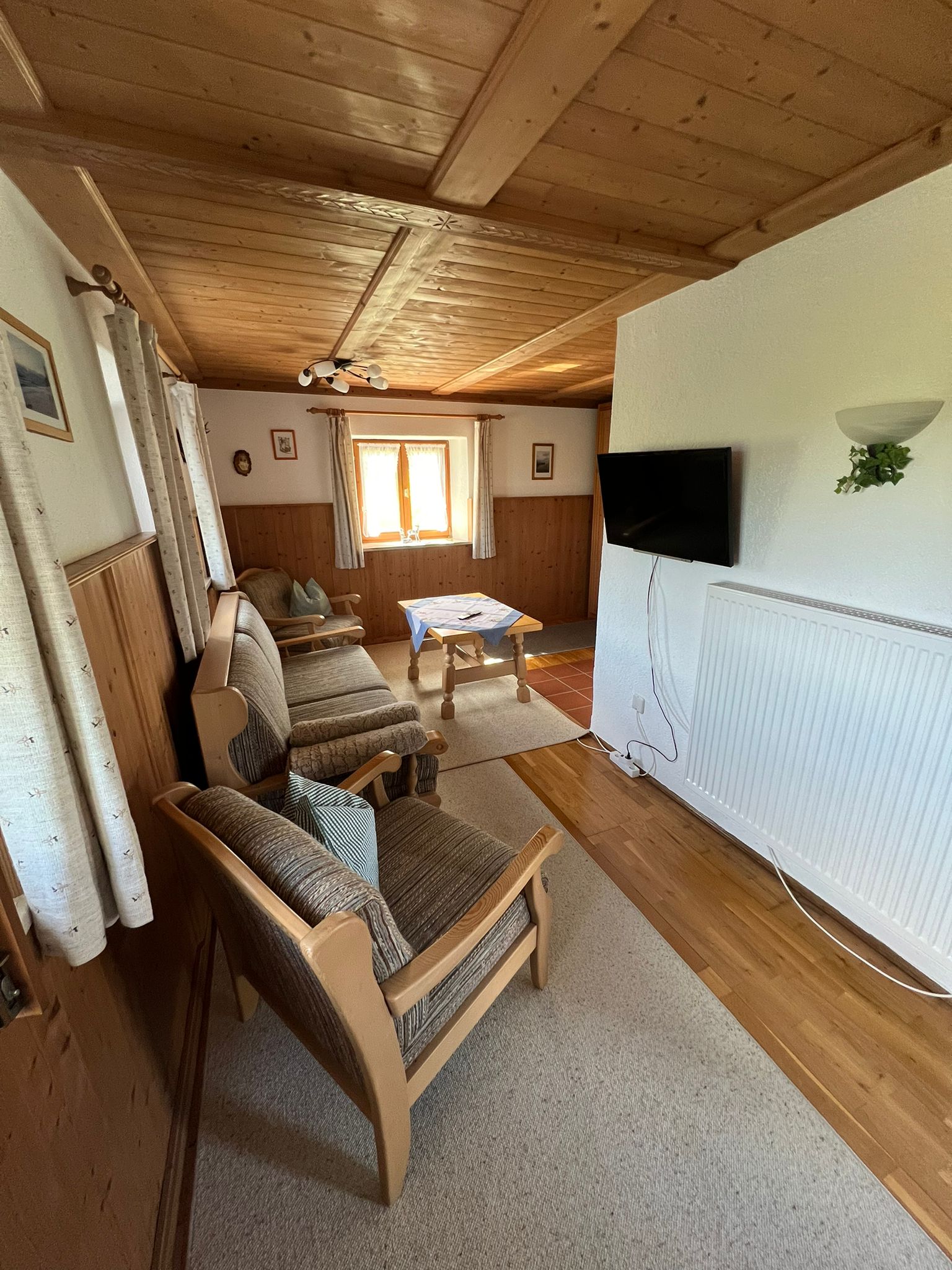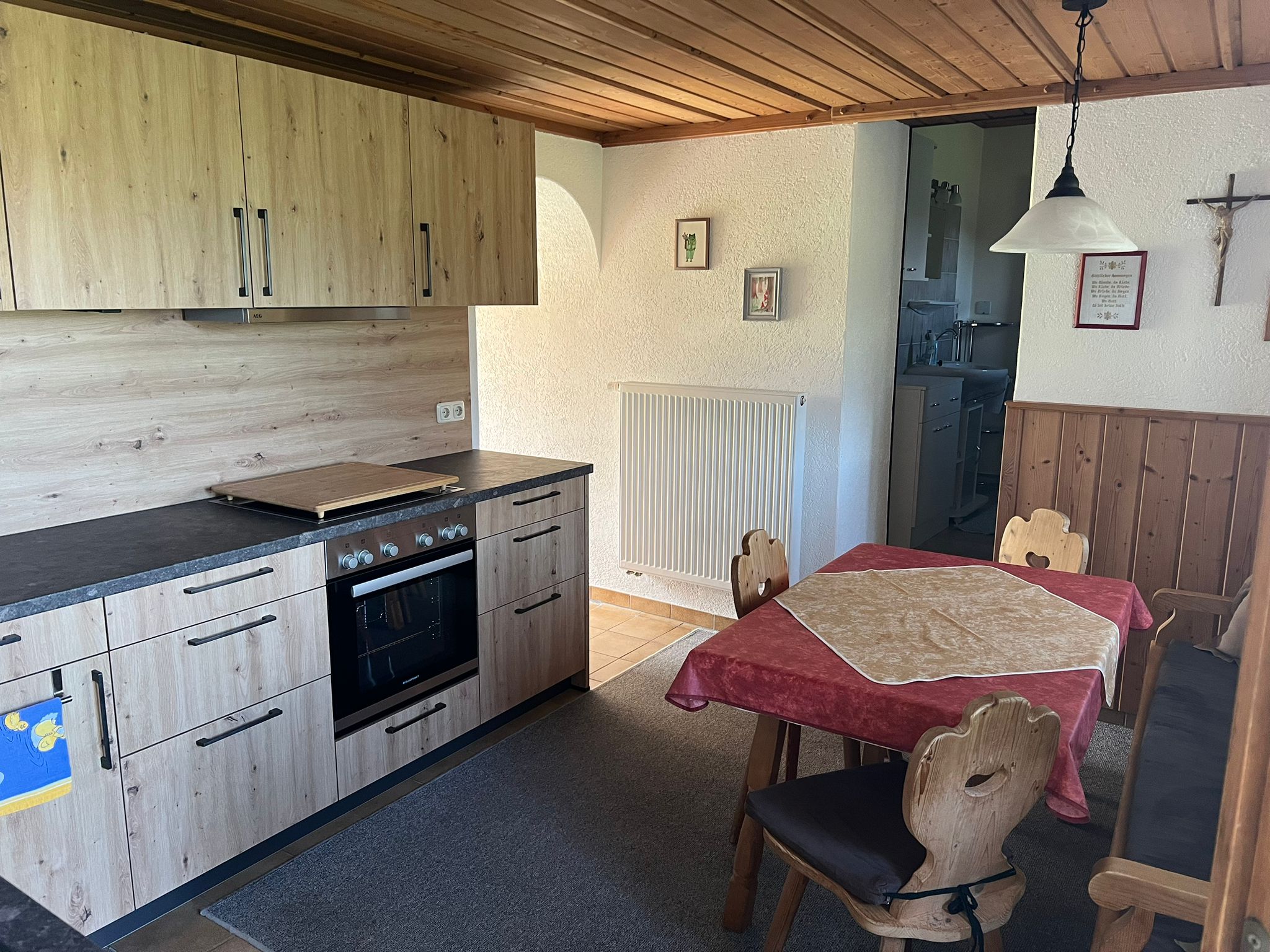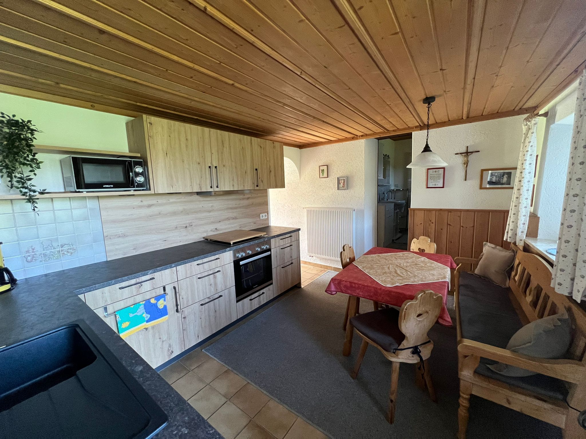 Neue Große vollausgestattete Küche mit Essbereich, kleines Bad mit Dusche und WC, gemütliches Wohnzimmer mit ausziehbarer Couch und Schrankbett als Seperate Schlafgelegenheit, 1 Schlafzimmer unten mit Doppelbett, 1 Schlafzimmer oben mit Doppelbett und zwei Einzelbetten, Kinderbett und Hochstuhl auf Anfrage zum dazustellen