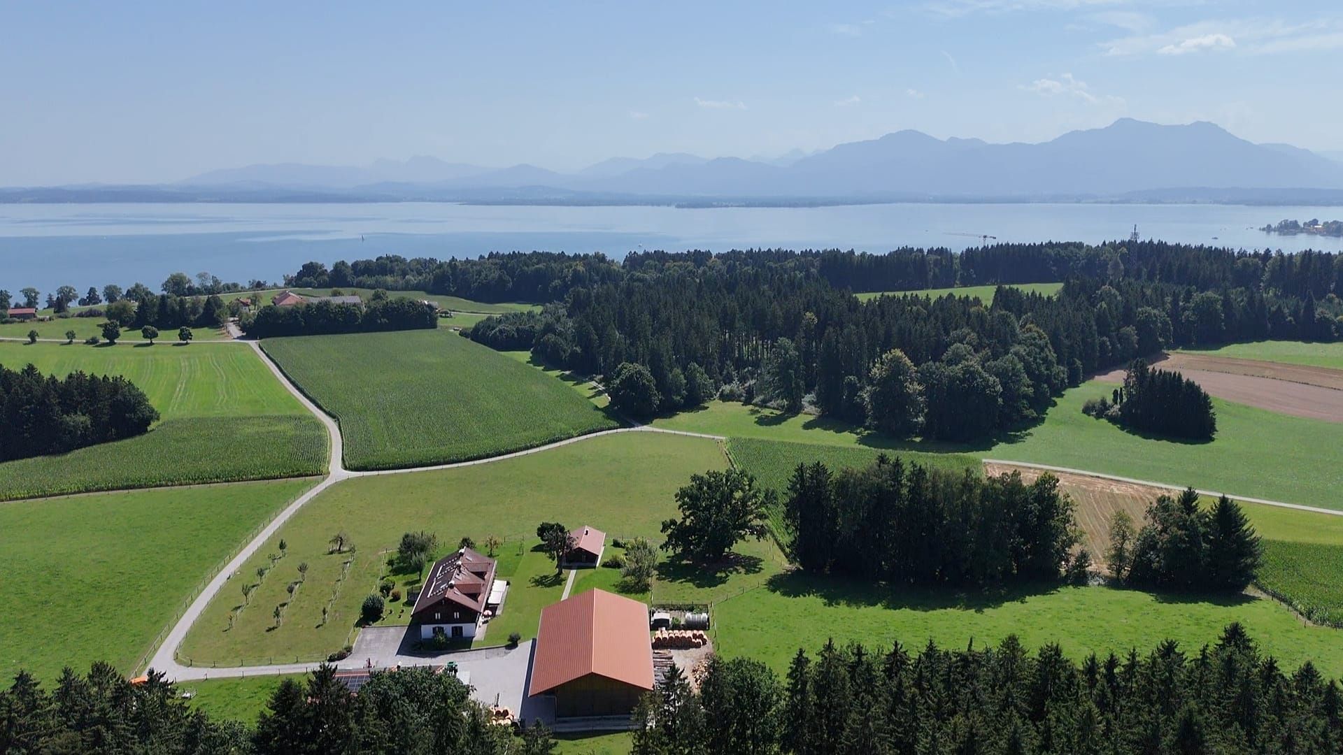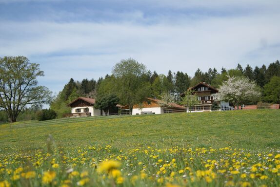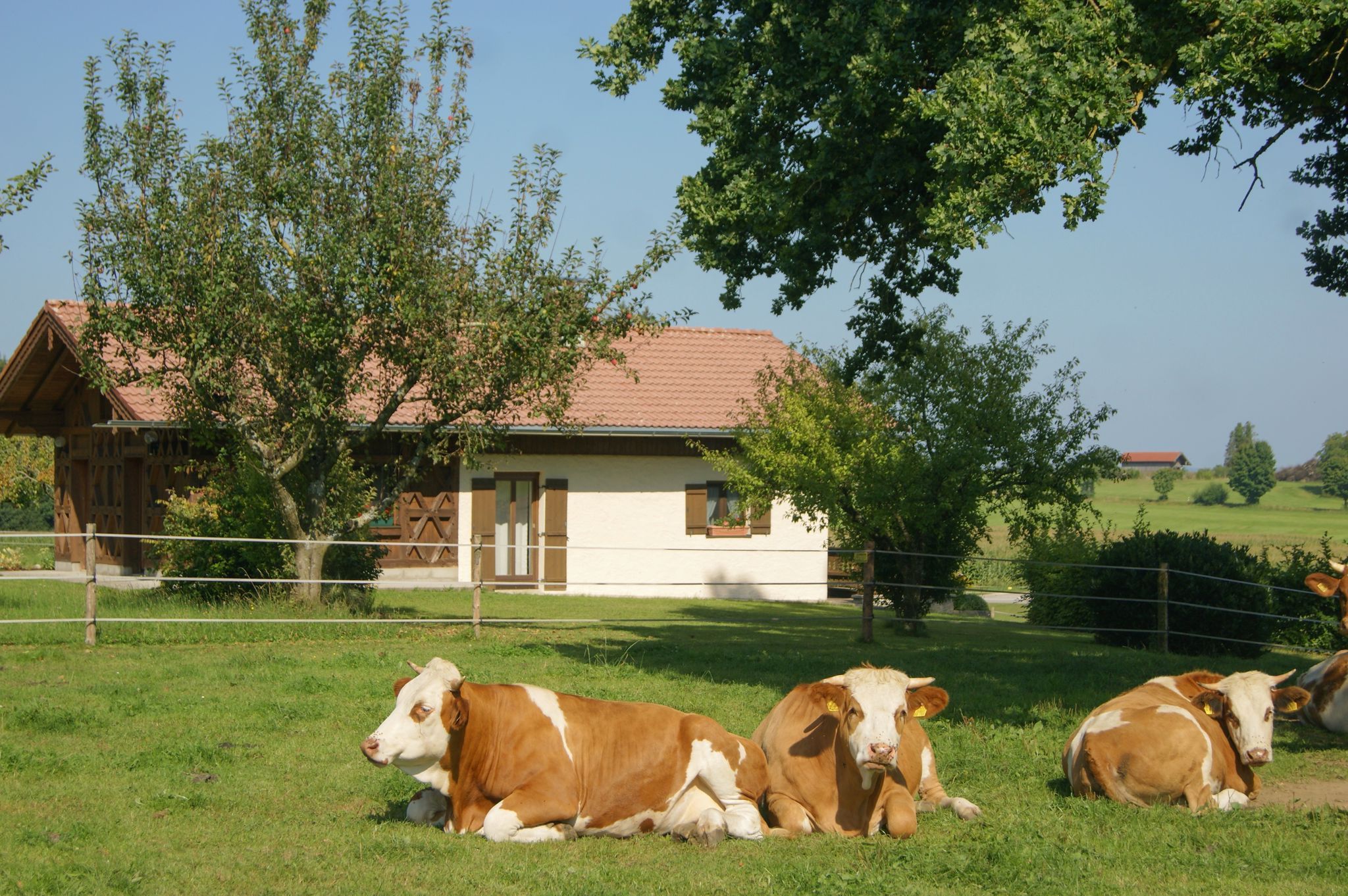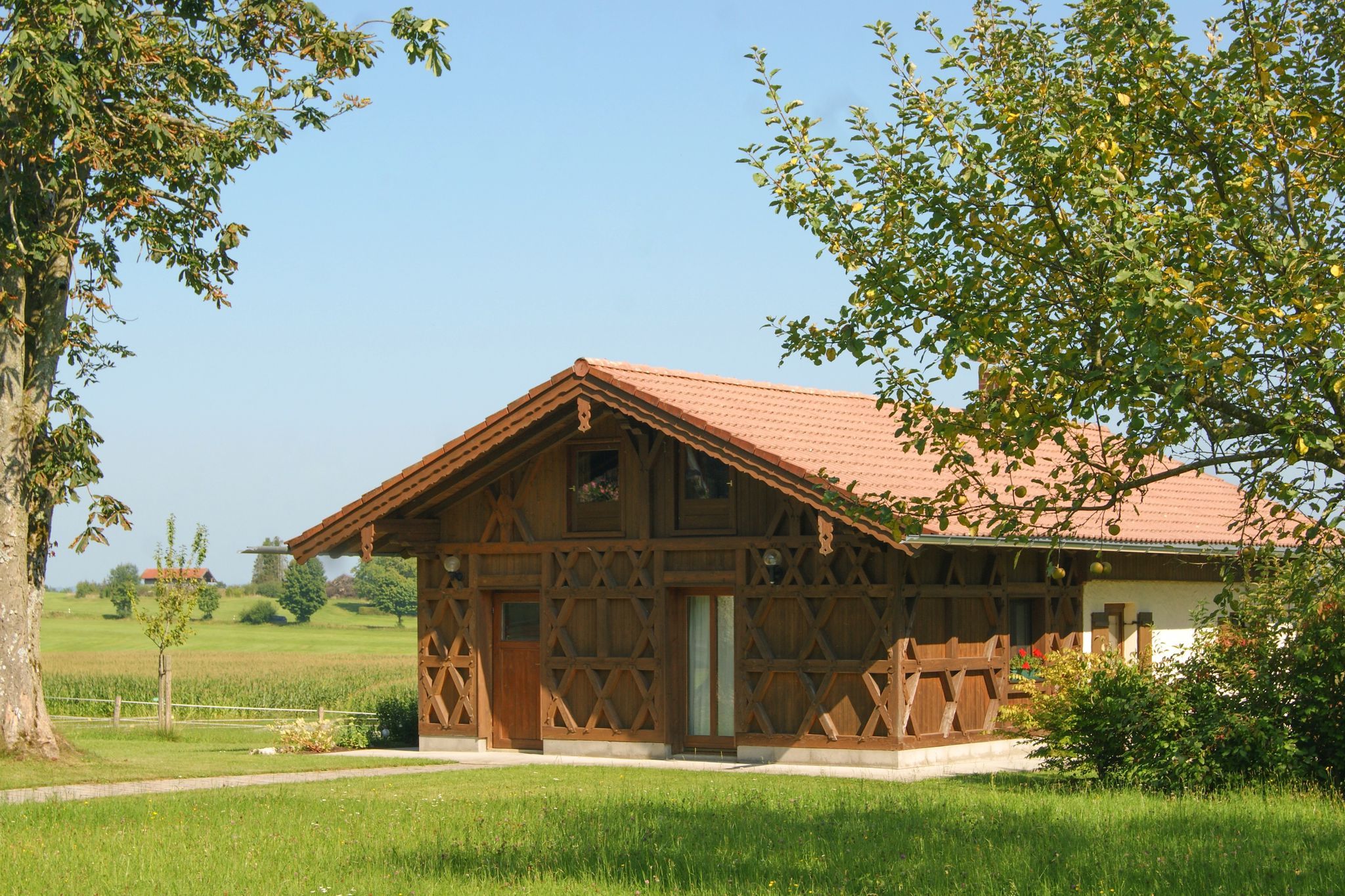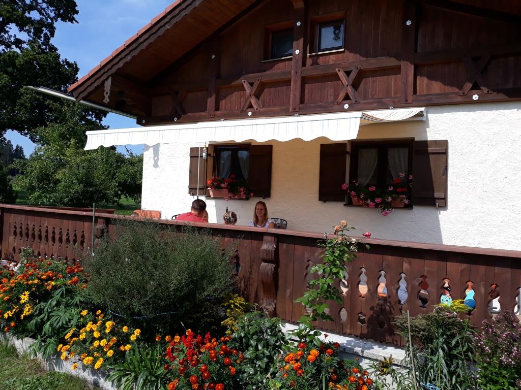 Ferienhäuschen in sehr ruhiger Lage, wie auf einer Alm, Große Terasse, Liegewiese, Grillplatz mit Blick zu den Bergen, Weidetiere um das Ferienhäuschen, in der nähe vom Wald, Rad- und Wanderwege, zu Fuß 10 Min. zum See.