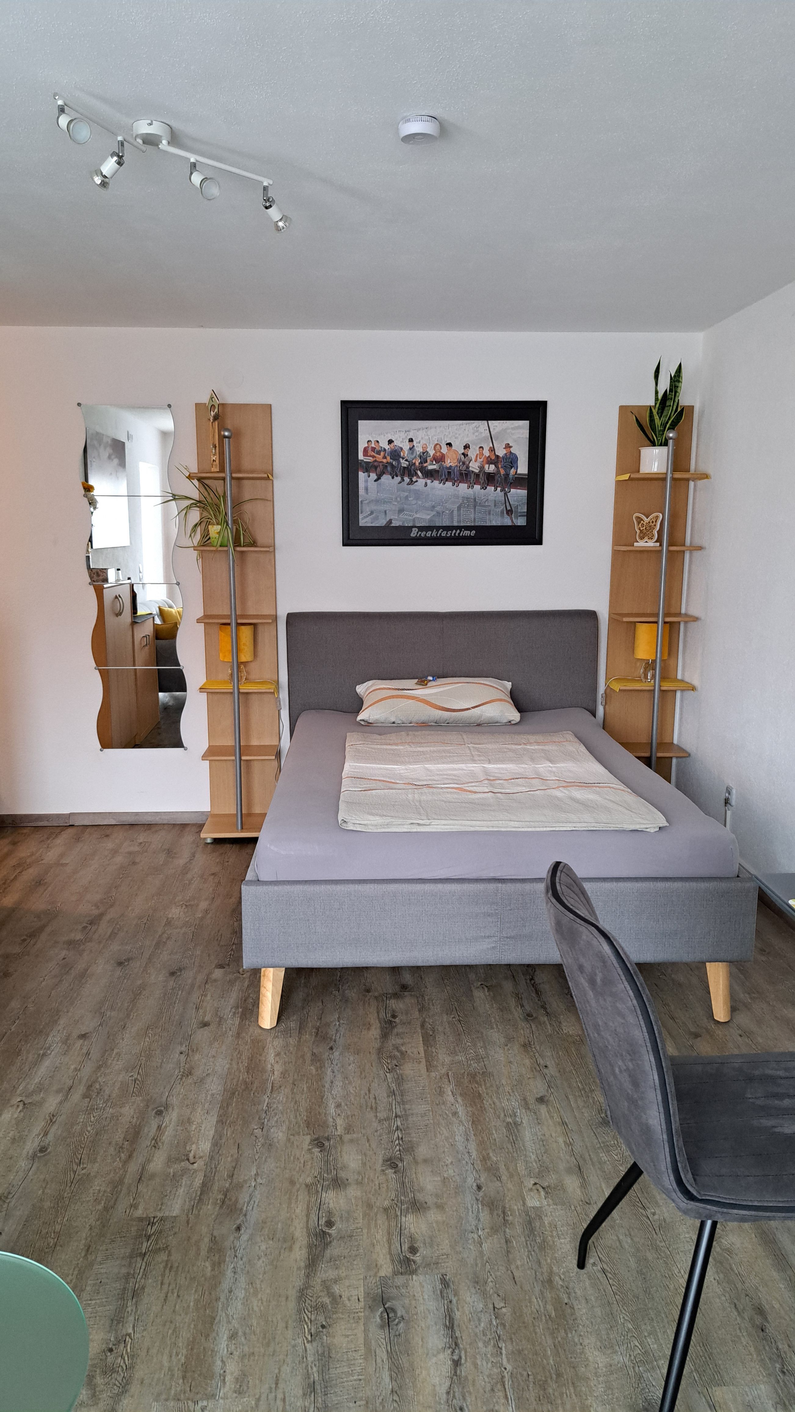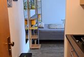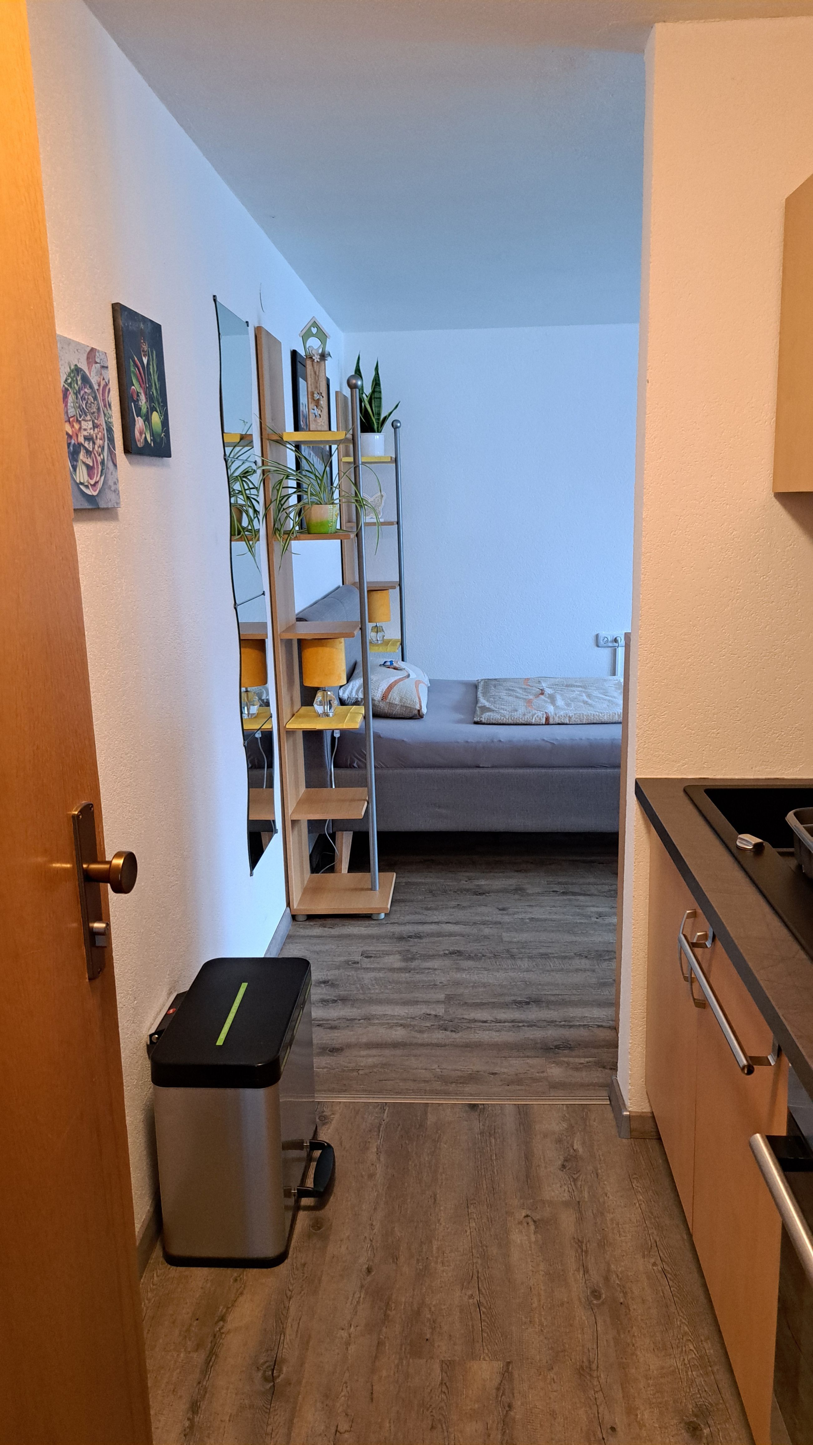 Eingangsbereich mit Flur in der die Küche integriert ist, großer Wohn-Schlafraum mit Essgruppe, kleiner Zwischenraum in dem der Kleiderschrank untergebracht ist, Badezimmer mit WC und Dusche