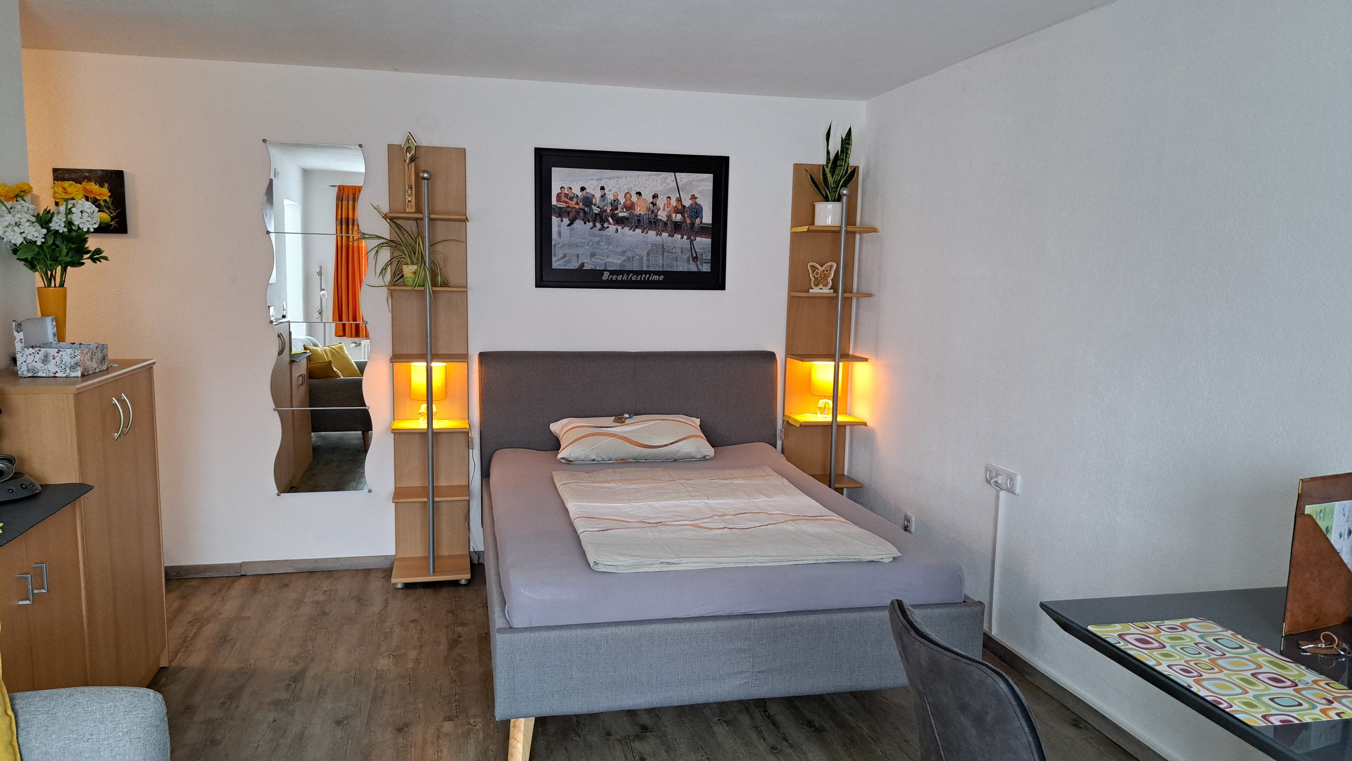 großes Bett mit 1 Nachtschrank, Liegefläche 140x200 cm, Couch für 2 Personen, Essgruppe für 2 Personen, Kühlschrank mit Gefrierfach, TV