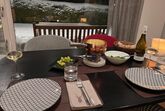 Die Terrasse ist ausgestattet mit 2 Sonnenliegen, Markise, Tisch und Gasgrill.