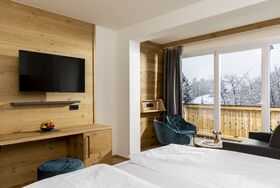 Doppelzimmer Dolomit mit Dusche oder Bad, WC getrennt, Haarfön, Radio, Safe, FLAT-TV, Telefon, Minibar, Gratis WLAN, Balkon.