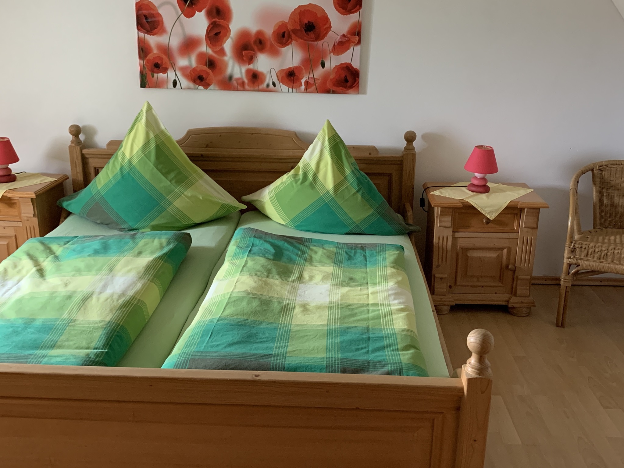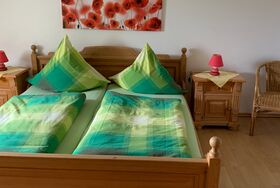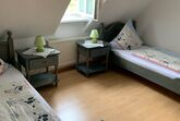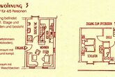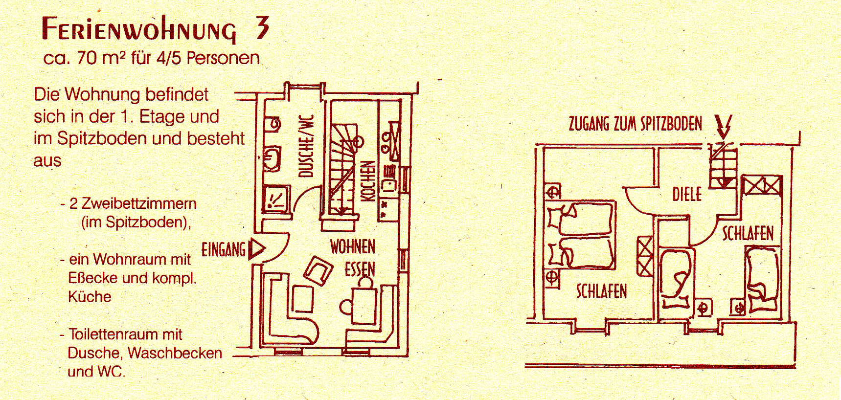 Die freundlich und stilvoll gestaltete Wohnung 3 ist ca. 70 qm groß. Die in sich abgeschlossene Wohnung befindet sich in der 1. Etage, mit Schlafräumen bestehend aus einem Doppelbett mit einem Kinder/-Babybett, sowie einem Zweibettzimmer im Obergeschoss. Im Wohnraum befindet sich eine Essecke, eine Couchgarnitur, Sat-TV und eine komplett ausgestattete Küche (inklusive Spülmaschine, Kühlschrank, Kaffeemaschine, Wasserkocher, Backofen, Toaster). Im Bad mit Fenster ist eine Dusche, ein Waschbecken und ein WC.