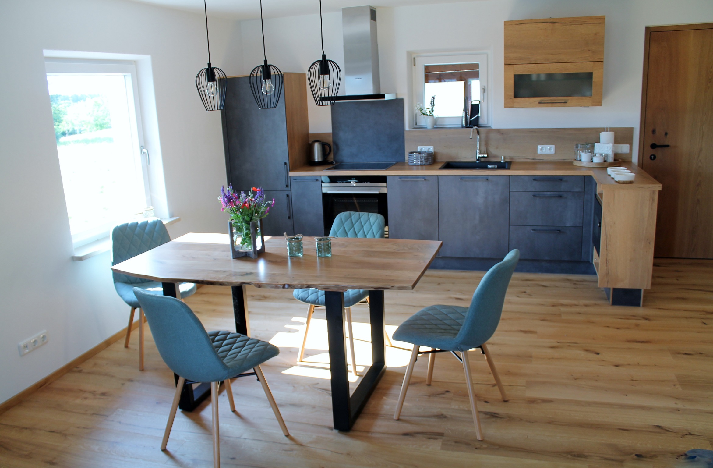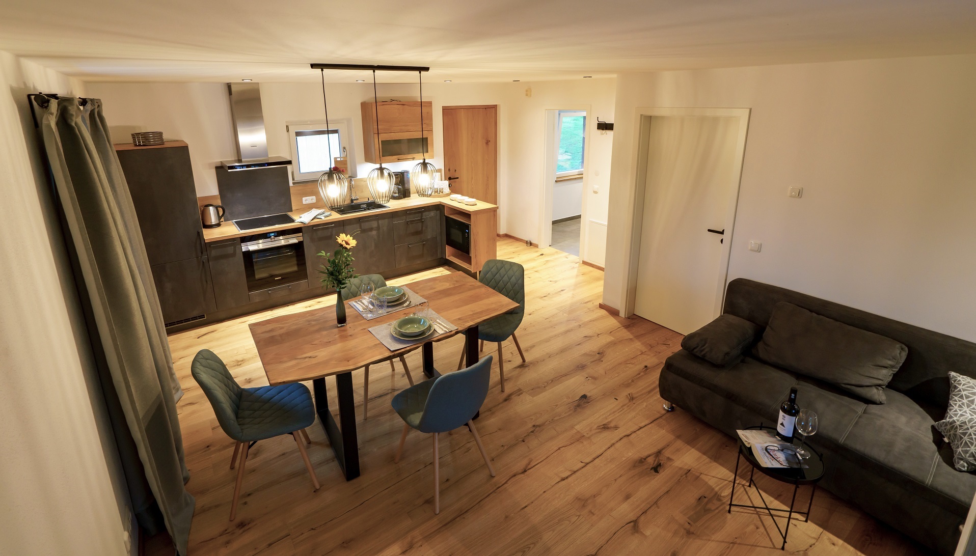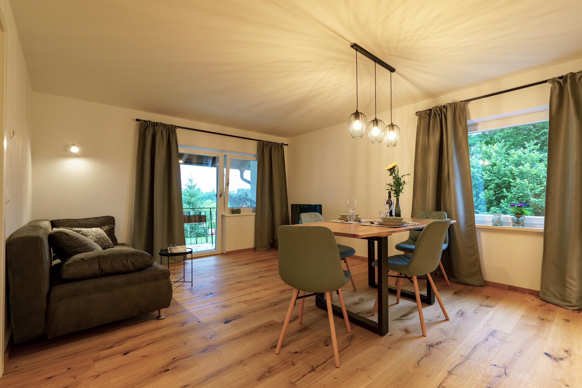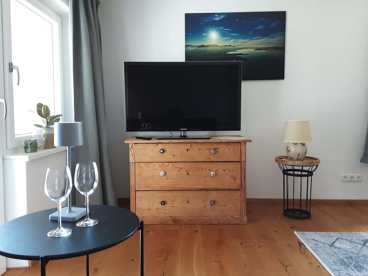 Unsere offene Wohnküche lädt Sie ein zum Kochen, Essen und Plaudern. Sie verfügt über einen großzügigen Koch-Essbereich der in die TV- Ecke übergeht. Die Küchenzeile ist gut ausgestattet mit einem Backofen, Cerankochfeld, Kühl-Gefrierkombination, Spülmaschine, Kaffeemaschine, Mikrowelle, Toaster, Wasserkocher. In der TV Ecke finden Sie eine Couch mit Schlaffunktion,einen Flach-TV und eine Leselampe. Nutzen Sie unser freies WLAN.Das helle Badezimmer besticht durch seine Regendusche und den Waschtisch aus echtem Holz.WC, Waschmaschine, Handtuchtrockner, Fön und Handtücher sind in dem geräumigen Bad vorhanden. Sanften und erholsamen Schlaf verbringen Sie in einem weißen, romantischen Doppelbett im schlichten Design, der freundliche und warme Stil hat eine beruhigende Wirkung. Für die Unterbringung Ihrer Bekleidung dient ein 2-türiger Kleiderschrank aus Holz. Zur Abdunkelung der Räumlichkeiten gibt es in jedem Zimmer farblich abgestimmte Vorhänge, Bettwäsche ist auch für Sie da. Relaxen Sie auf dem schönen Balkon der über den Wohn und Schlafbereich zu erreichen ist. Nutzen Sie die Sitzgelegenheit für ein schönes Frühstück und genießen Sie auf den Liegen den Ausblick auf die heimischen Berge.