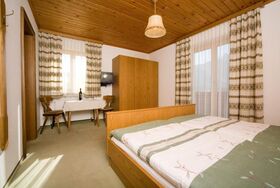 Das 20m² große Doppelzimmer verfügt über einen Balkon, ist mit hellen Naturholz Möbeln eingerichtet und mit Dusche und WC, einer Sitzgruppe und TV ausgestattet.