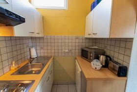 Das im Landhausstil eingerichtete Studio im Erdgeschoss verfügt über einen großen Raum mit Ess-, Wohn- und Schlafbereich und bietet Platz für zwei bis drei Personen. Weiters heißt sie eine mit zahlreichen Küchengeräten ausgestattete Küche, die vom Vorraum offen zugänglich ist, willkommen.
