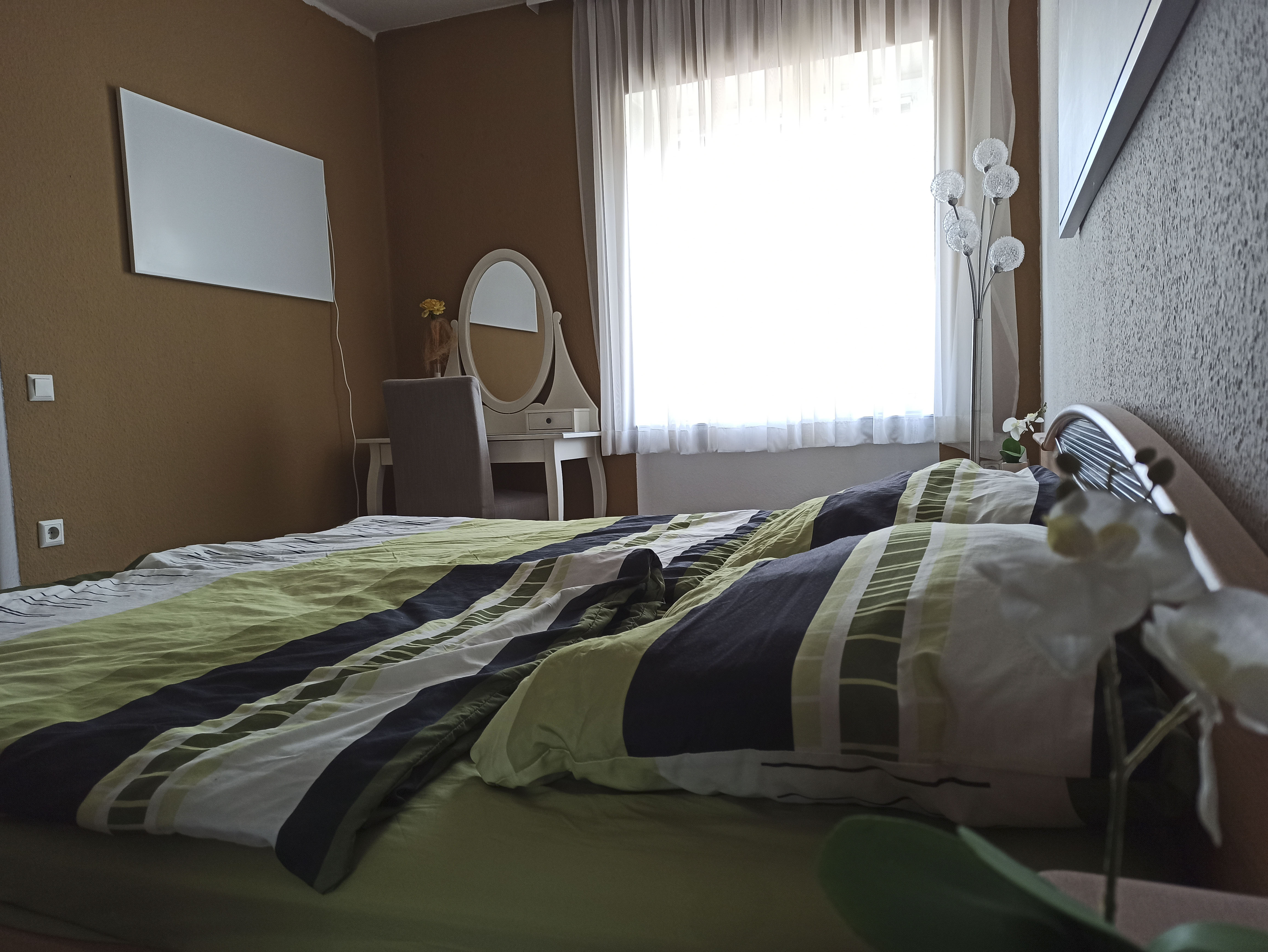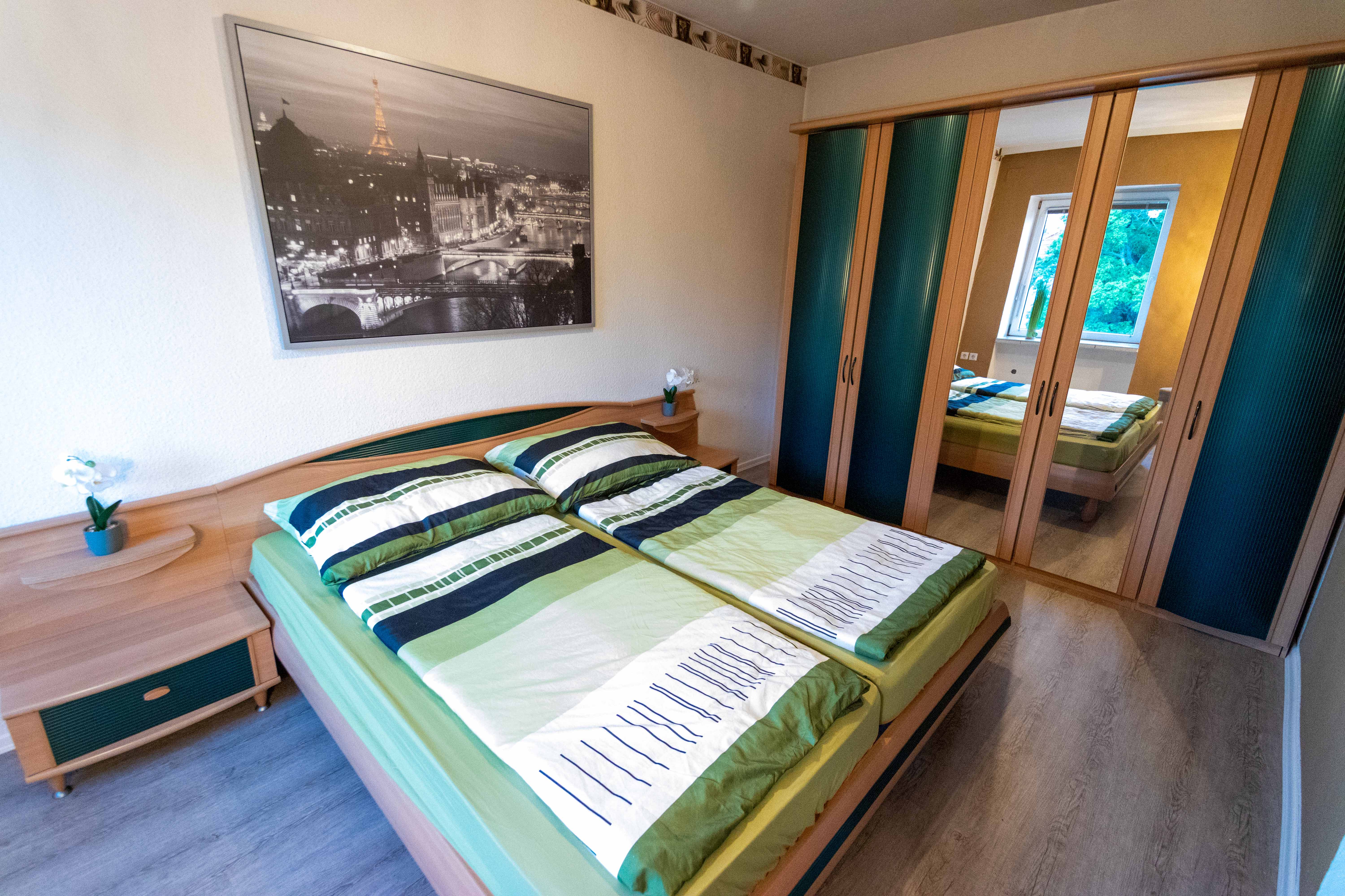 Im Schlafzimmer befindet sich ein großes Doppelbett (1,80 x 2 m) und ein großer Spiegelschrank. Bettwäsche ist vorhanden.
