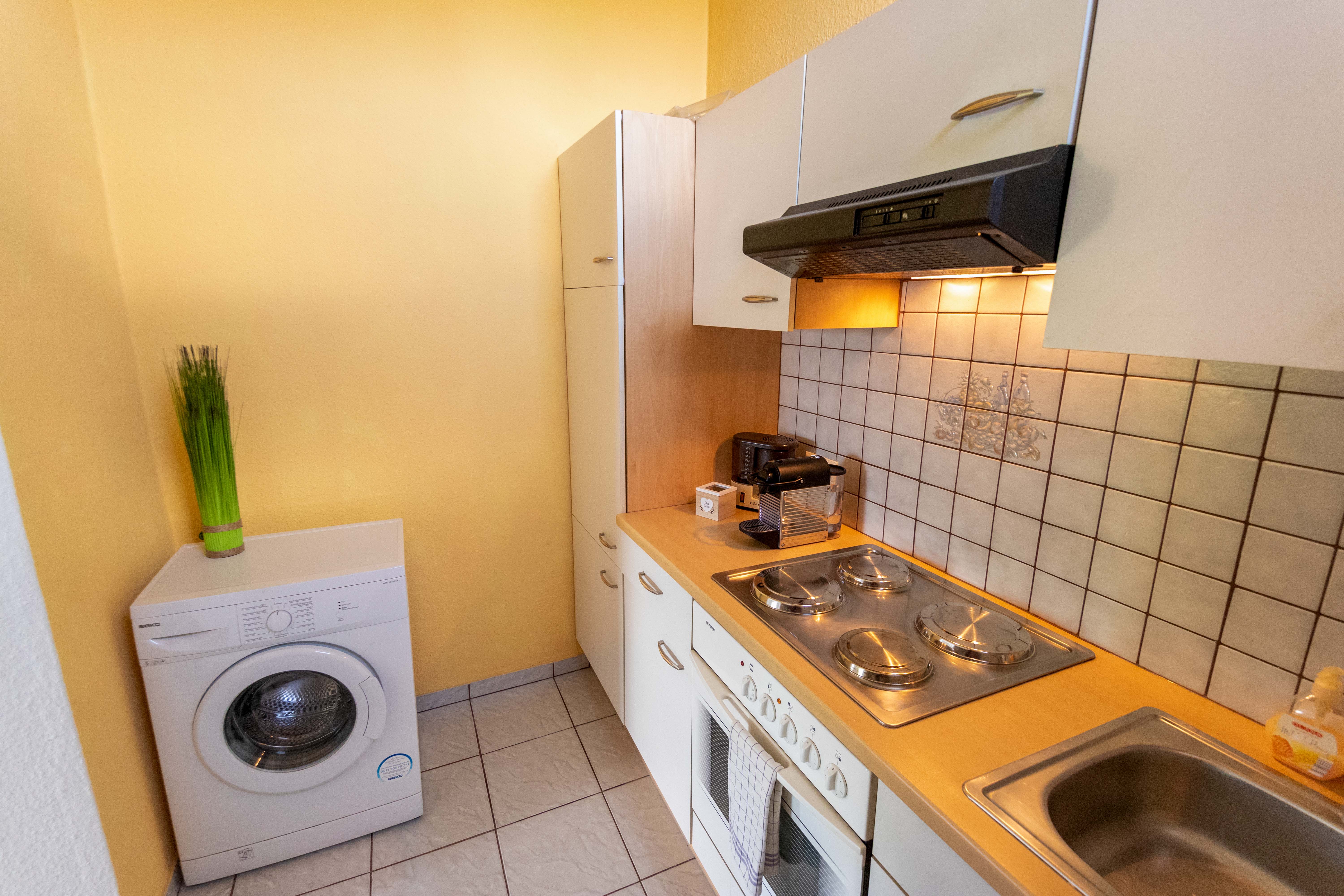 Die Küche ist komplett ausgestattet mit Herd, Backofen, Kühlschrank, Geschirrspüler, Mikrowelle, Nespresso-Kaffeemaschine, Wasserkocher, Eierkocher und natürlich sämtlichem Geschirr, Weingläsern, Töpfen und Pfannen. Weiters ist hier auch eine Waschmaschine vorhanden.
