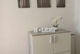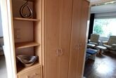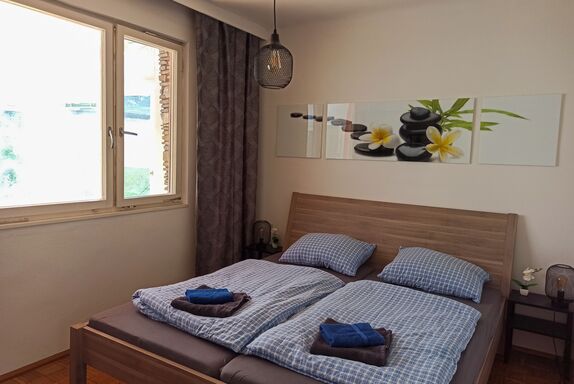 Im Schlafzimmer befindet sich ein großes Doppelbett (180 x 200) und ein Schrank. Bettwäsche ist vorhanden.